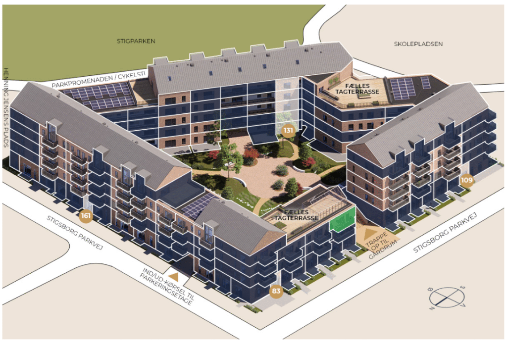I parkeringskælderen er der depotrum, cykelparkering og mulighed for leje af p-plads i eller tæt ved StigsborgHus.