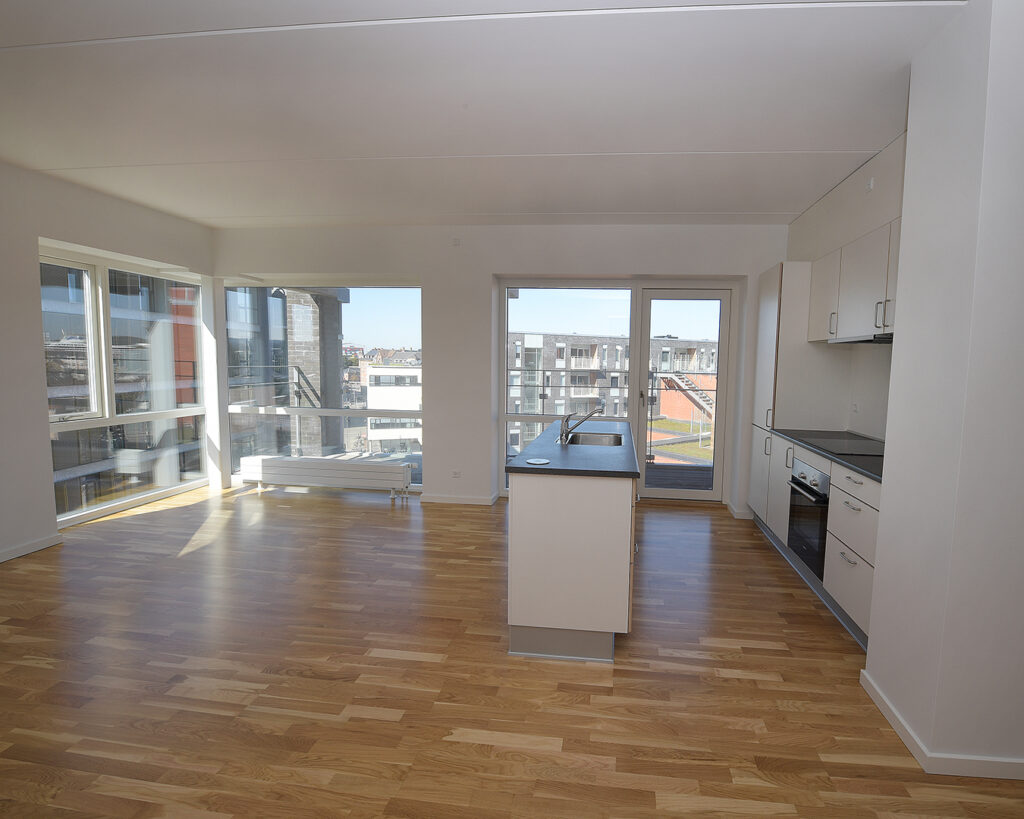 Dejlig lys 3 vær. lejlighed i nyere ejendom fra 2016 på det spændende godsbaneareal. Lejligheden indeholder køkken og stue i ét, rummeligt soveværelse med god skabsplads, godt stort værelse samt dejligt badeværelse. Interiøret i køkken, badeværelse samt garderobeskabe er hvidt med egetræskant fra Invita.
