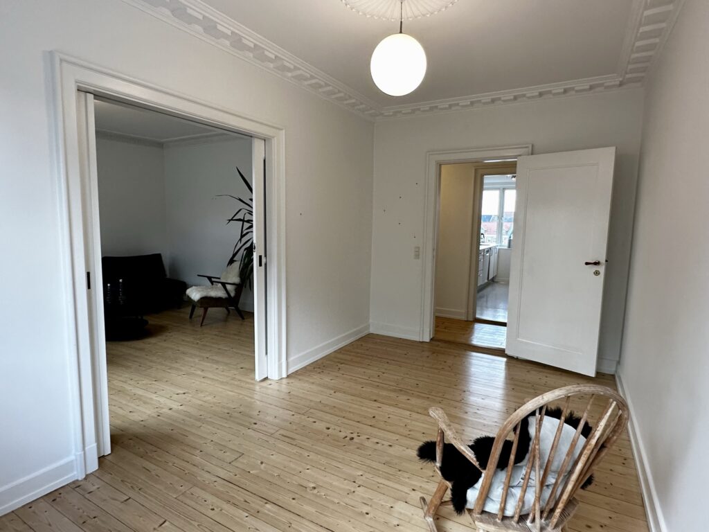 Lejligheden er med pæne trægulve og smukke stuklofter, der giver lejligheden sjæl og charme.