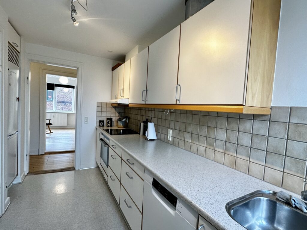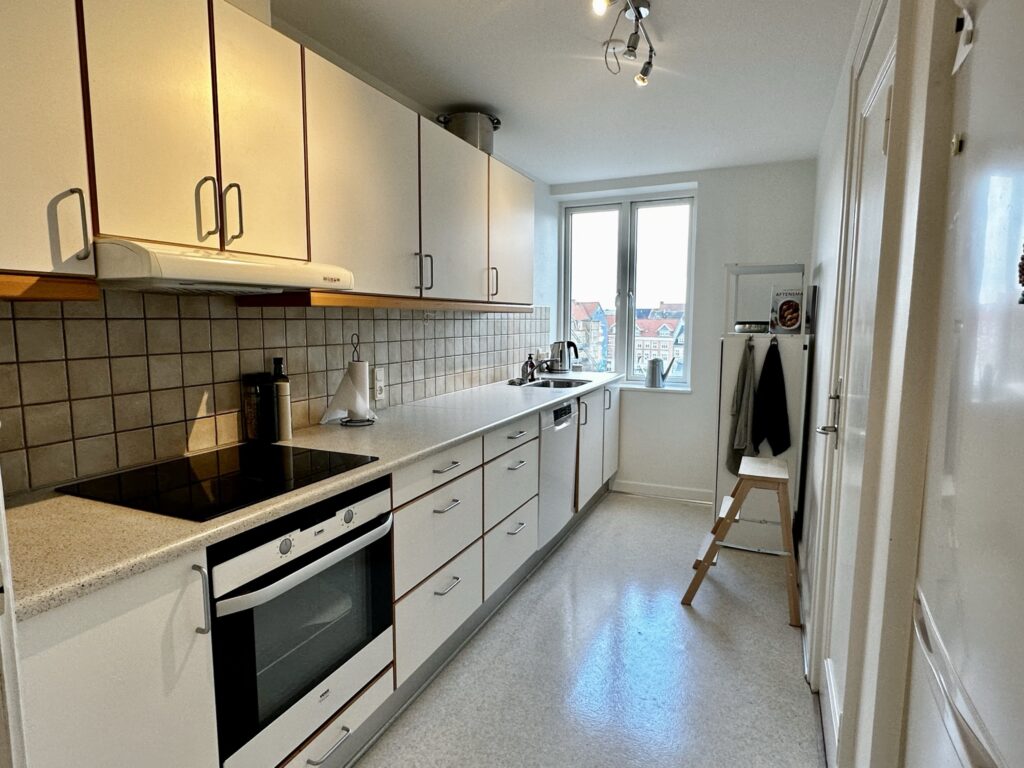 Lejligheden er indrettet rummelig entré, fint køkken med masser af skabsplads, stort soveværelse med garderobeskabe, 2 store stuer en-suite adskilt med hvide skydedøre samt et dejligt badeværelse med kombineret vaske/tørremaskine. Fra soveværelset er der adgang til fin altan med kig ud over byens tage.
