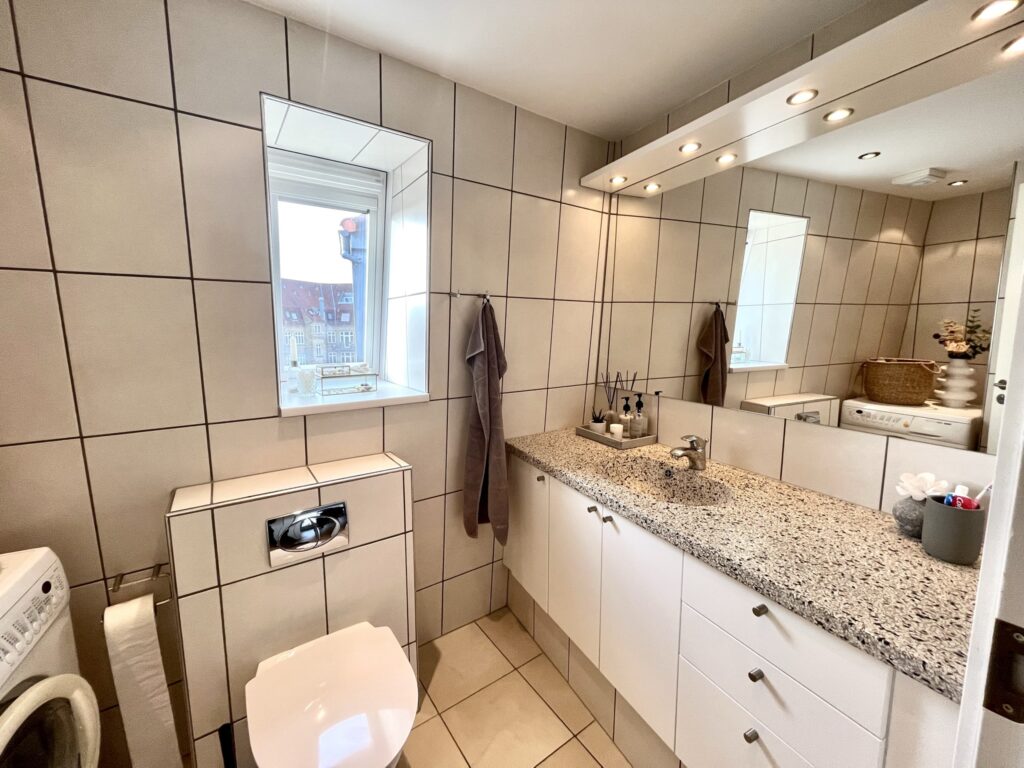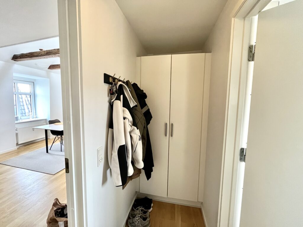 Lejligheden indeholder fin entré med garderobeskabe, lyst og lækkert badeværelse med flot terrazzobordplade, fin bruseniche og vaske-/tørremaskine. Lys og hyggelig opholdsstue/spisestue med fritlagte bjælker og med fint køkken i forlængelse.
