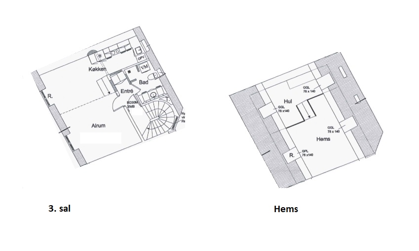 Fra stuen går der trappe op til lejlighedens store hems, som udgør soveværelset. Fra hemsen er der åbent kig til køkken/spisestue.