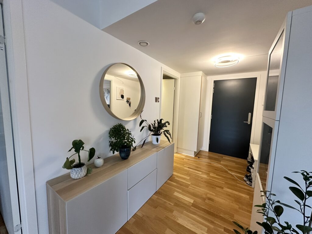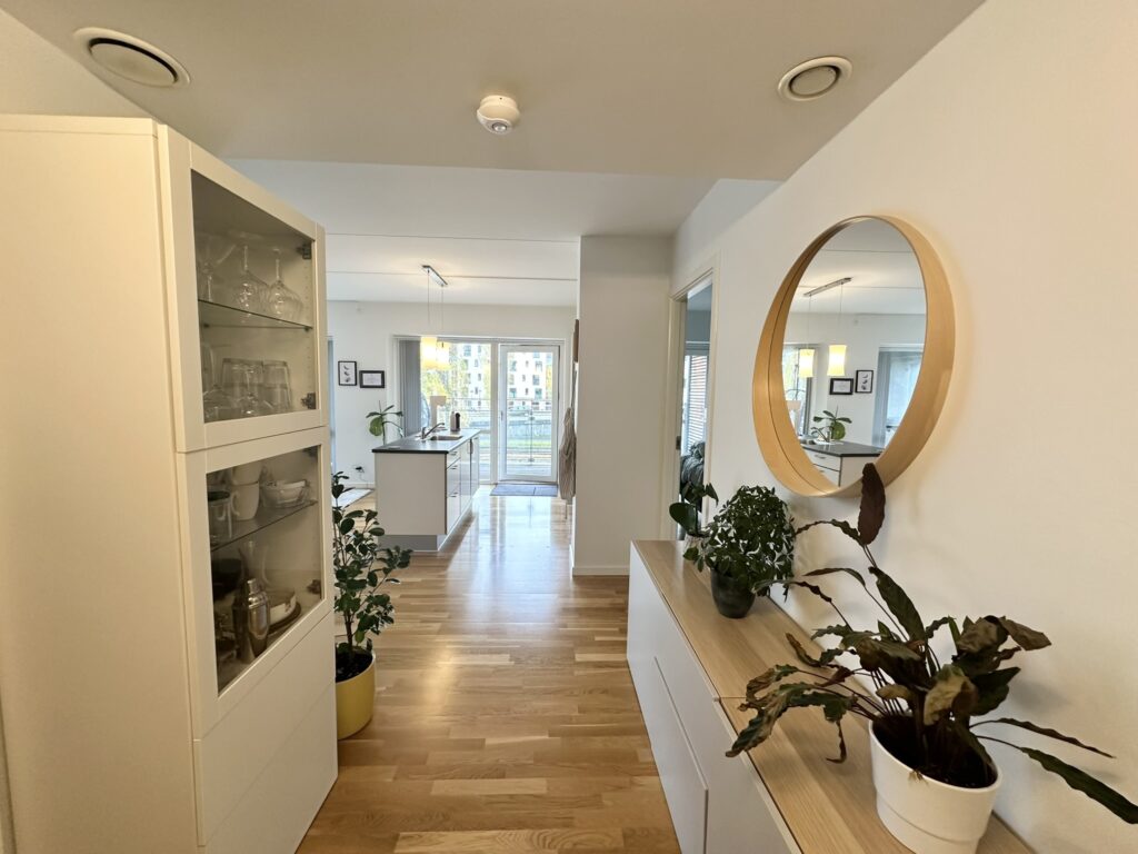 Der er flot interiøret i køkken, badeværelse samt garderobeskabe er hvidt med egetræskant fra Invita, flotte egetræsparket i alle rummene pg lyse klinker og gulvvarme på badeværelset.