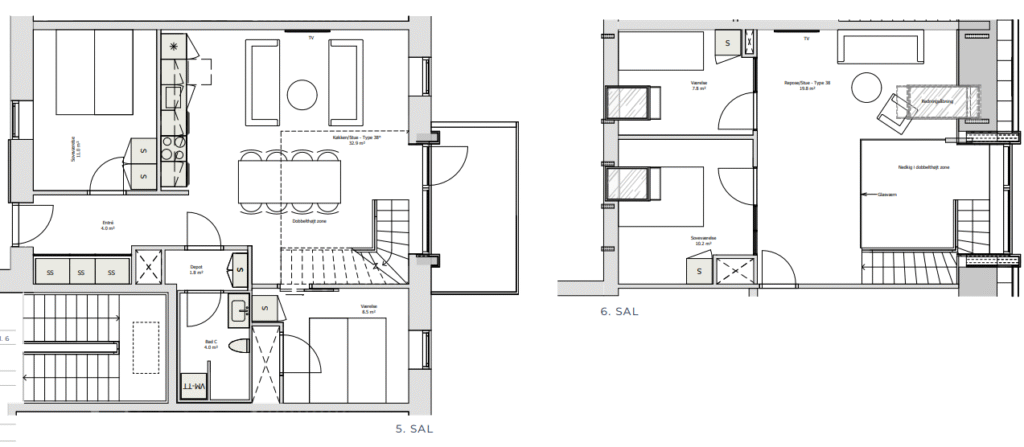 Fra leverummet er der en trappe til 6. sal, hvorfra fjordkig følger med op i de gennemgående glaspartier. På dette niveau er 2 værelser med faste skabe, ovenlysvinduer og brandsikkert glas, som gør det muligt, at invitere fjordkig og lys ind i værelserne. Der er ligeledes en dejlig stue. Vi har også 5-værelses lejligheder i 1. plan – kontakt os endelig hvis du ønsker, at høre mere om dem.