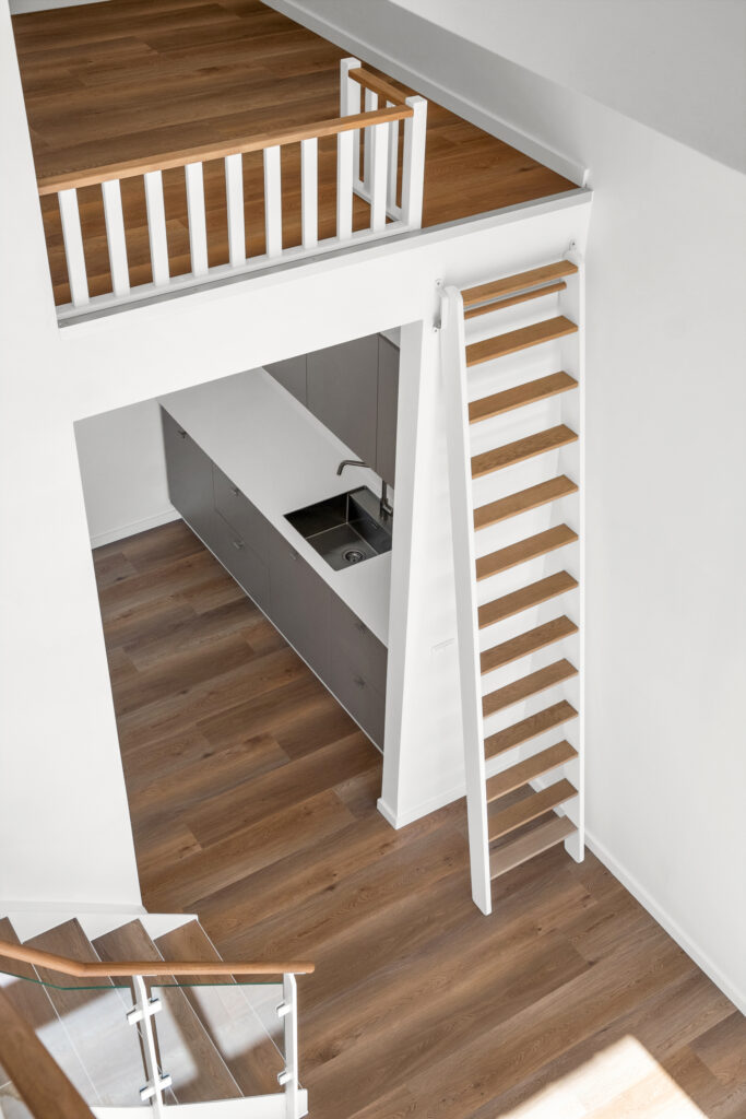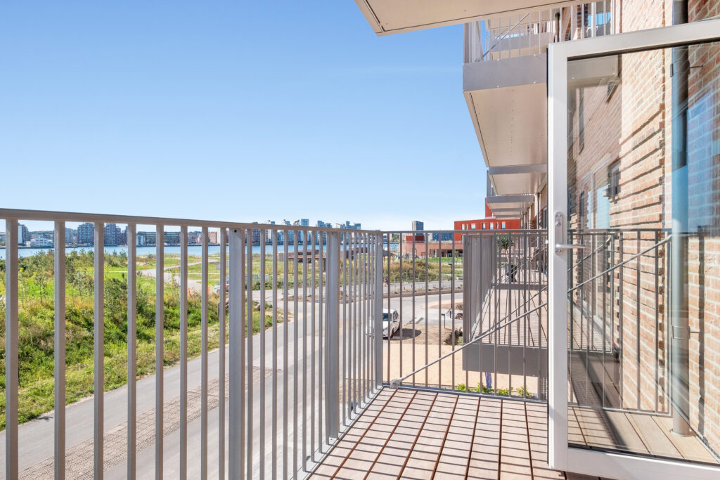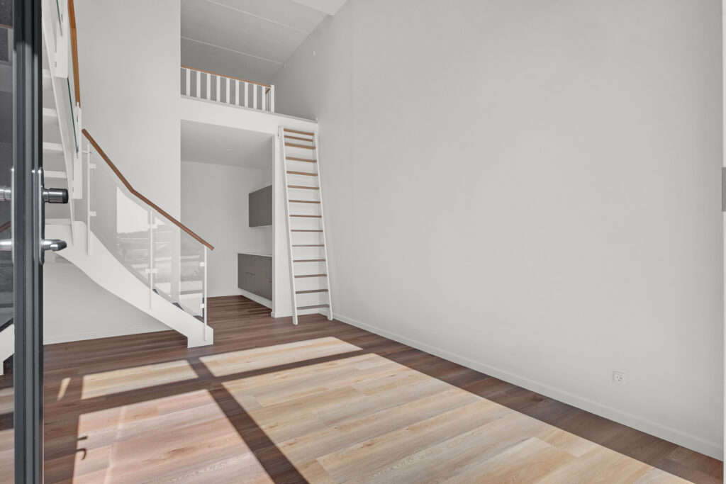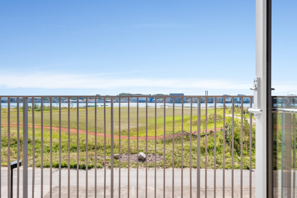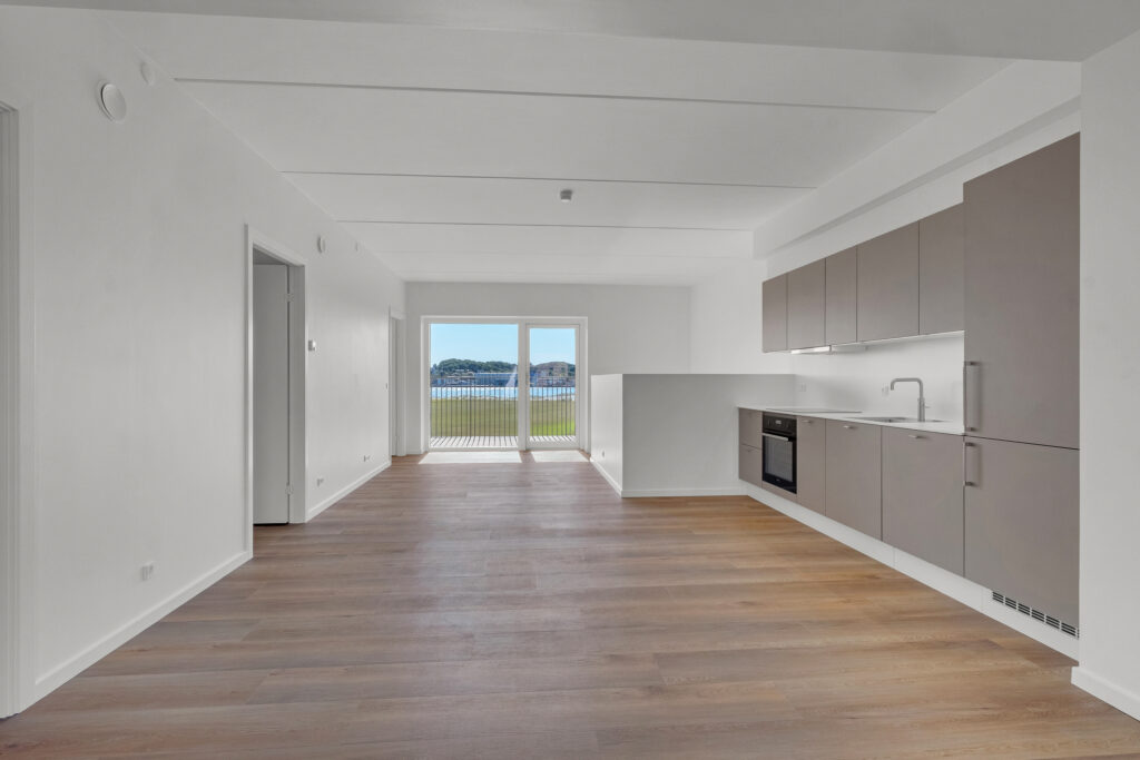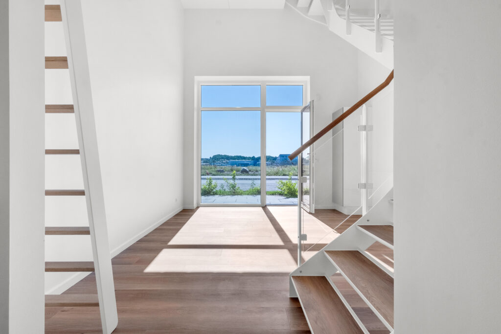 1. sal kan også tilgås fra egen terrasse (14 m2) fra gårdrummet. Her kommer man ind i leverummet med køkken/alrum/stue ud i ét. Her er store vinduespartier i begge ender, som giver et fantastisk lysindfald og ikke mindst en smuk udsigt til Stigsparken og fjorden. 1. sal indeholder også 2 værelser samt badeværelse. Fra opholdsrummet er der adgang til stor altan på 8 m2.