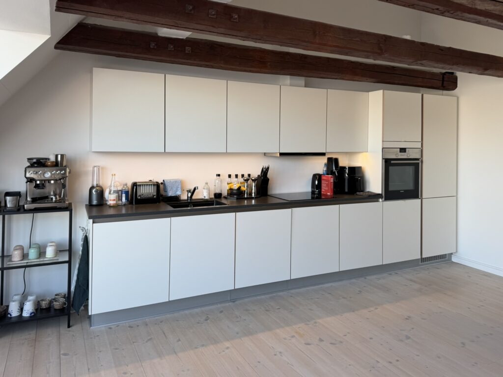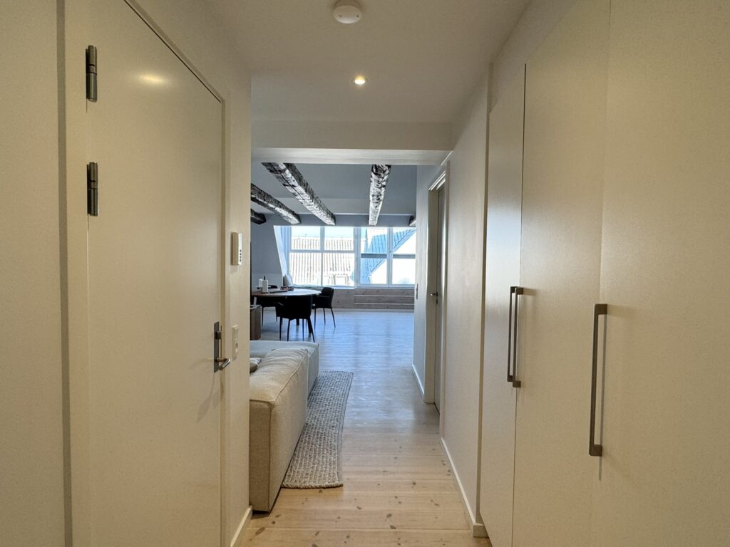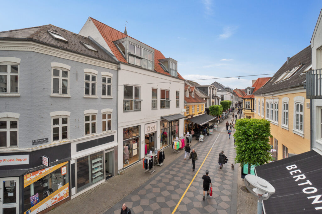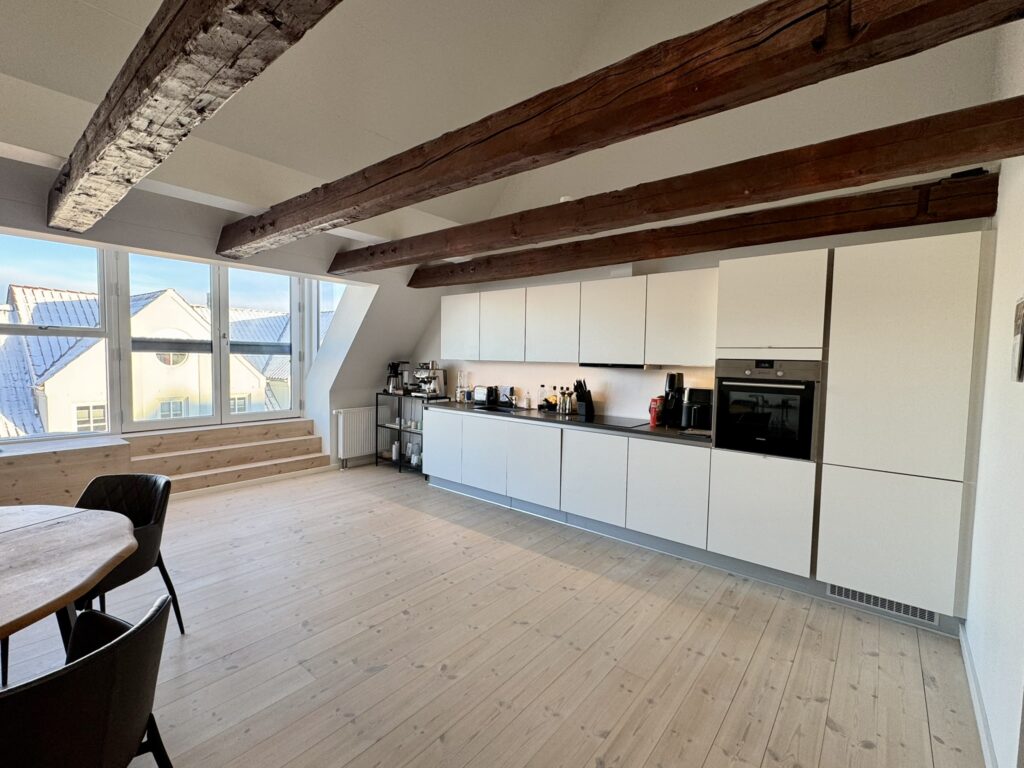 Når man træder ind i lejligheden kommer man først til en fin entré med skabe, hvorfra man kommer ind i det store, smukke og lyse køkkenalrum. Køkkenalrum er med et stort vinduesparti med dobbelt fransk altan mod gågaden – hvor man kan sidde og følge med i byens liv i gågaden. I køkkenalrummet er der charmerende synlige bjælker med LED lys.