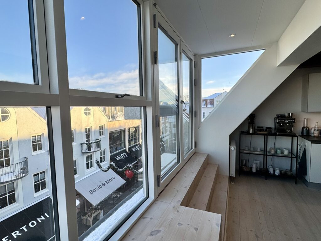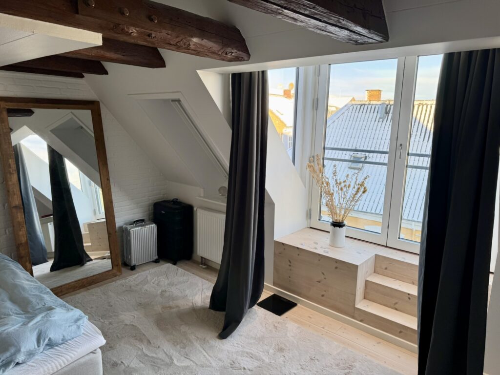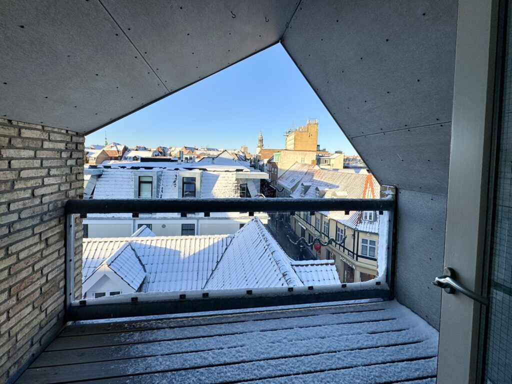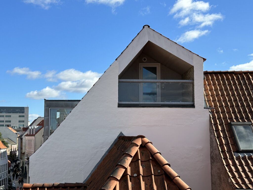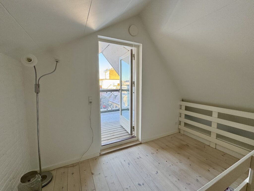 Lejligheden indeholder herudover et godt soveværelse med faste skabe samt fransk altan mod Vor Frue Kirke, et lækkert lyst badeværelse, en stor hyggelig stue, hvor der ligeledes er dobbelt fransk altan mod gågaden. Fra stuen er der adgang til hems, hvor der er plads til et lille kontor og herfra er der udgang til stor og lækker overdækket altan med udsigt til byens tage.