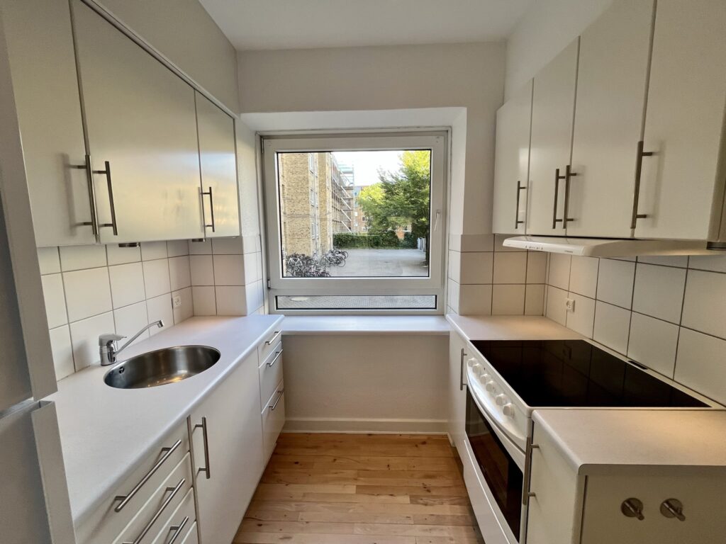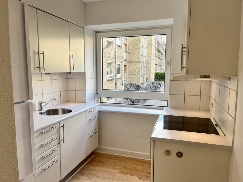 Lejligheden er indrettet med en lys fordelingsentré, en rummelig og lys stue, et stort soveværelse med fransk altan og garderobeskabe, et pænt badeværelse med en god bruseniche samt et rigtig flot og hyggeligt køkken med kig til gården.