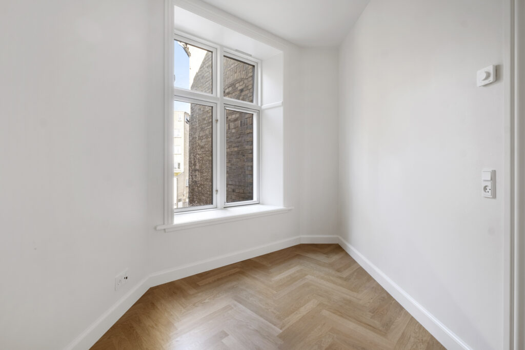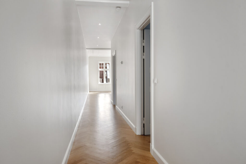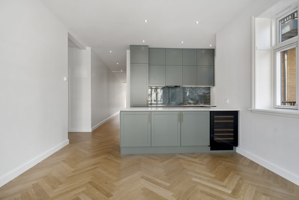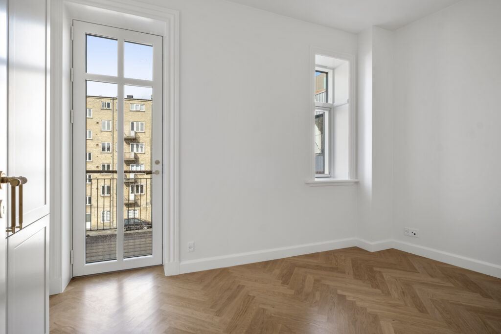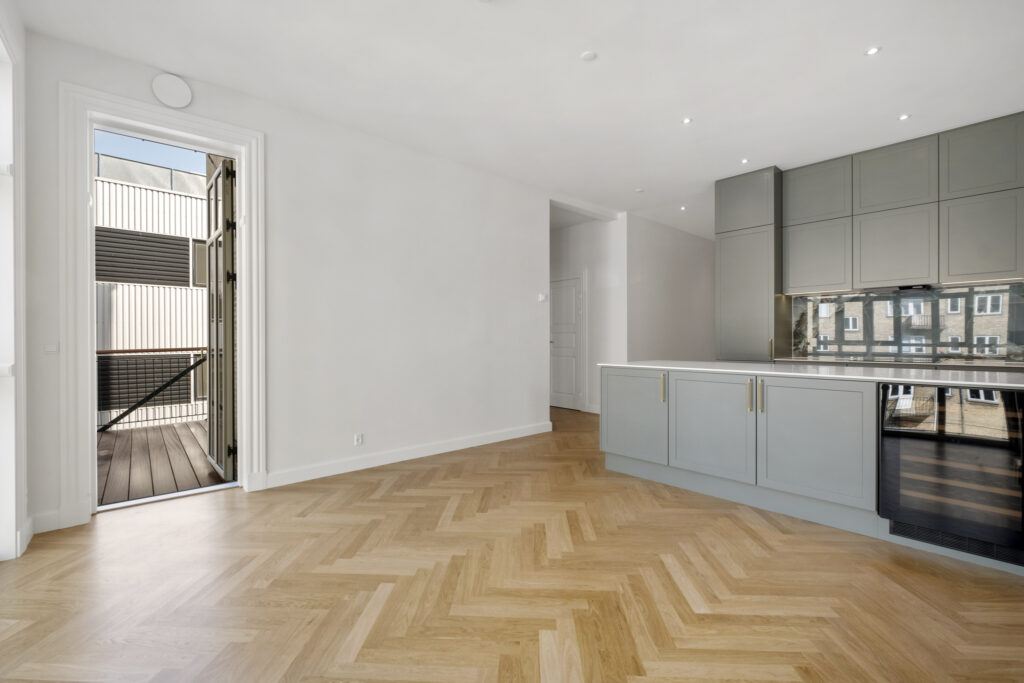 Lejligheden er beliggende på 2. sal, og er indrettet med en fin entré med garderobeskabe, flot stor stue med smuk bevaret stuk, et lækkert og moderne badeværelse, fantastisk køkkenalrum med udgang til altan, rummeligt soveværelse med skabsvæg og udgang til altan samt 2 værelser. Køkken og bad er med stilfuldt inventar fra Invita, der har den helt perfekte kombination af det klassiske design og et moderne tvist. Badeværelset er hvidt med egetræs lameller og køkkenet er støvet grønt med messing greb. Lejligheden er med flotte mat lakerede sildebensparket i eg, gulvvarme i alle rum, alt i hårde hvidevarer samt quooker og vinkøleskab. Straks man træder ind i lejligheden, vil man opleve, at der ved ombygningen er taget højde for ejendommens oprindelig karakter og er kælet for alle detaljer og materialer.