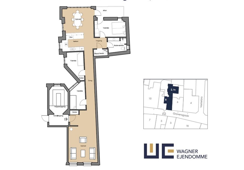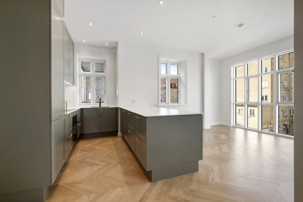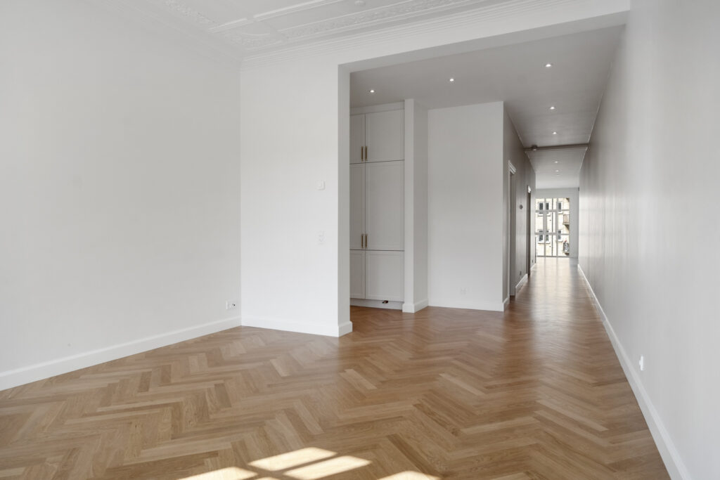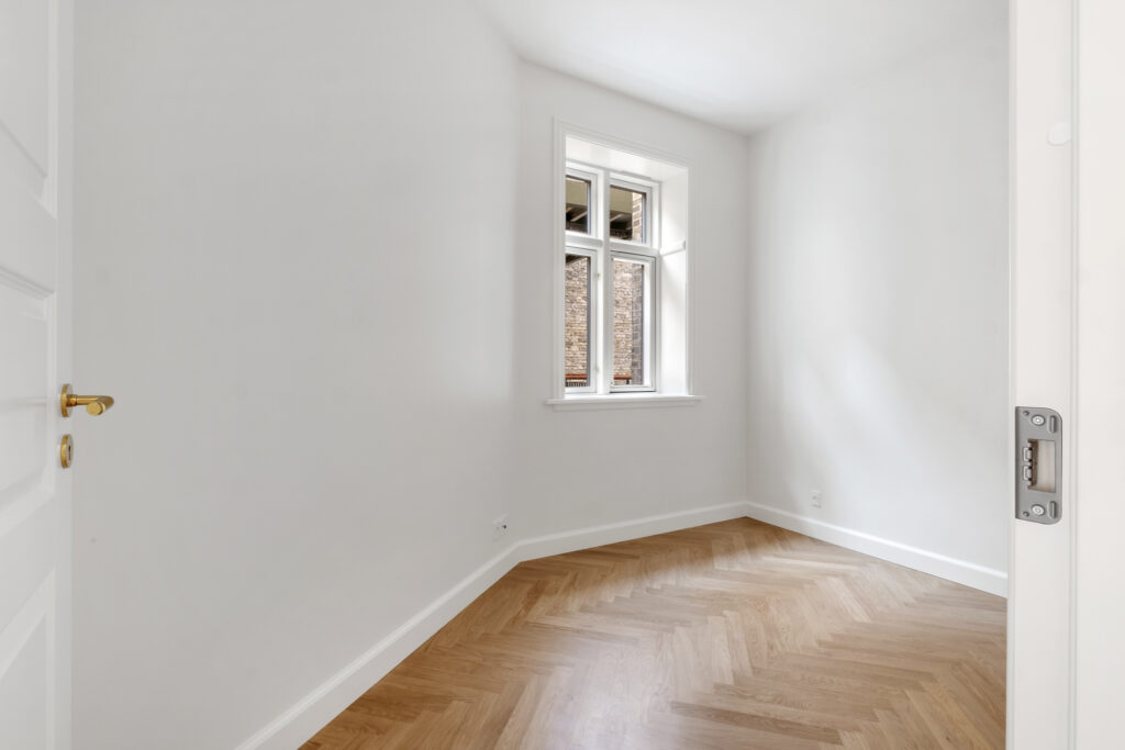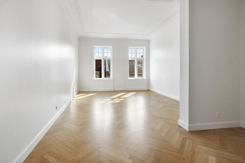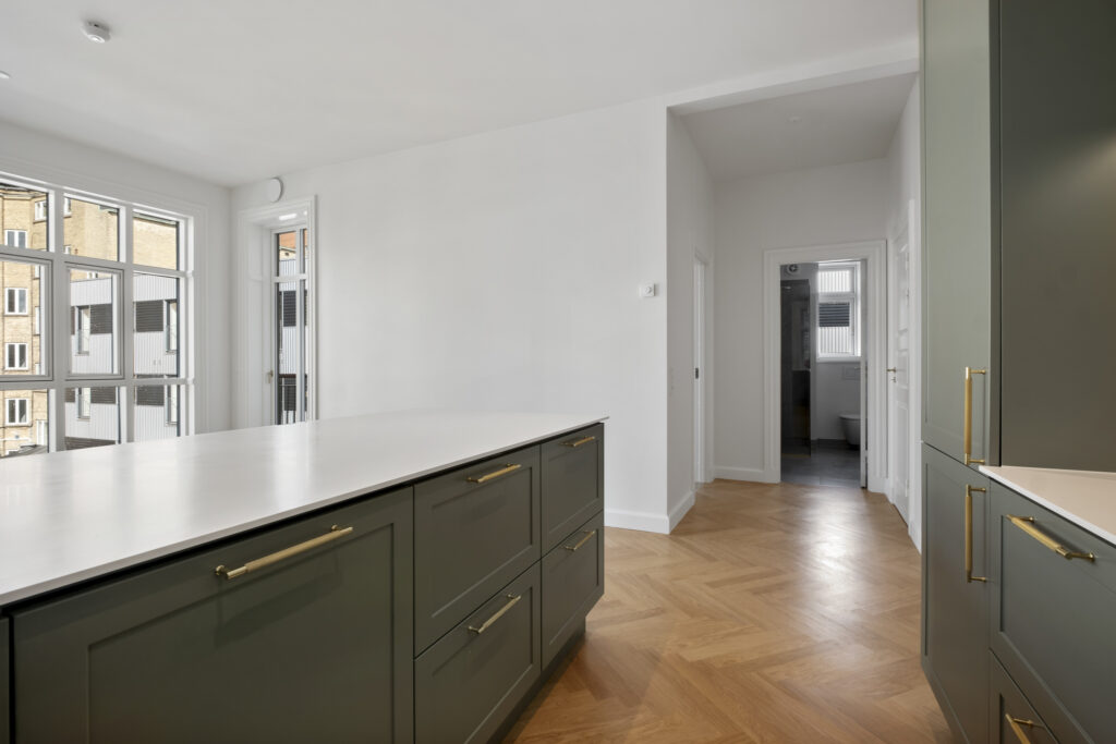 Lejligheden er beliggende på 2. sal, og er indrettet med en fin entré med garderobeskabe, flot stor stue med smuk bevaret stuk, et lækkert og moderne badeværelse, fantastisk køkkenalrum med udgang til altan, rummeligt soveværelse med skabsvæg og udgang til altan samt 2 værelser. Køkken og bad er med stilfuldt inventar fra Invita, der har den helt perfekte kombination af det klassiske design og et moderne tvist. Badeværelset er hvidt med egetræs lameller og køkkenet er støvet grønt med messing greb. Lejligheden er med flotte mat lakerede sildebensparket i eg, gulvvarme i alle rum, alt i hårde hvidevarer samt quooker og vinkøleskab. Straks man træder ind i lejligheden, vil man opleve, at der ved ombygningen er taget højde for ejendommens oprindelig karakter og er kælet for alle detaljer og materialer.