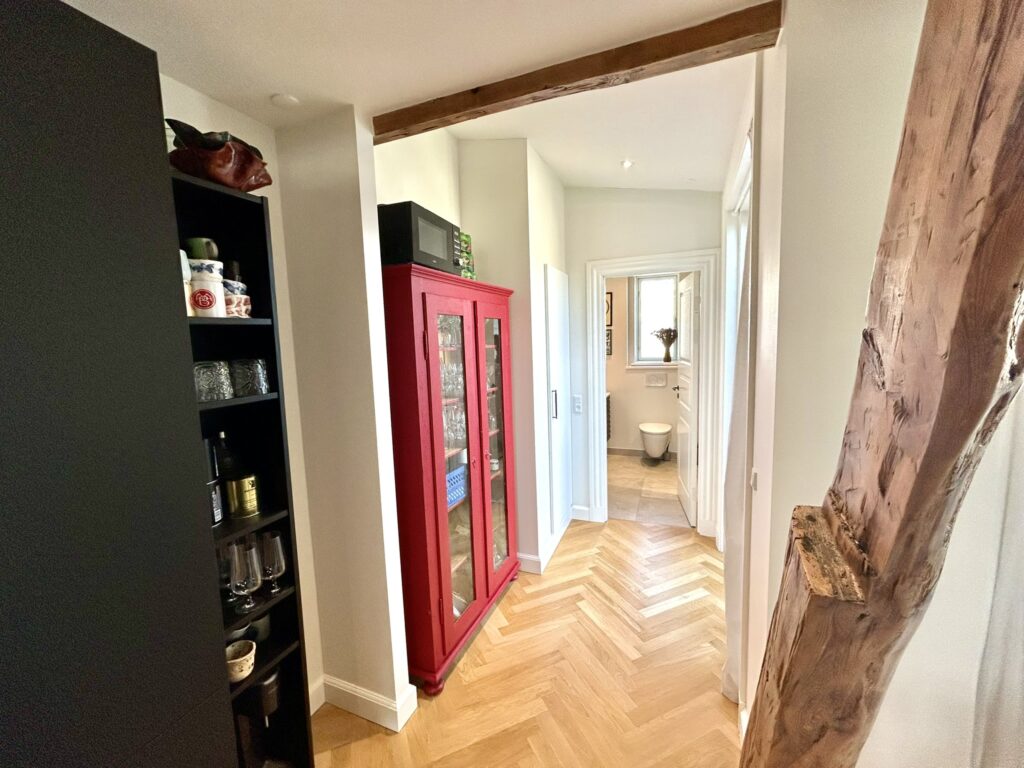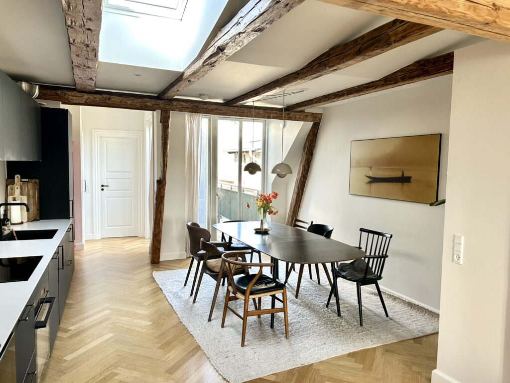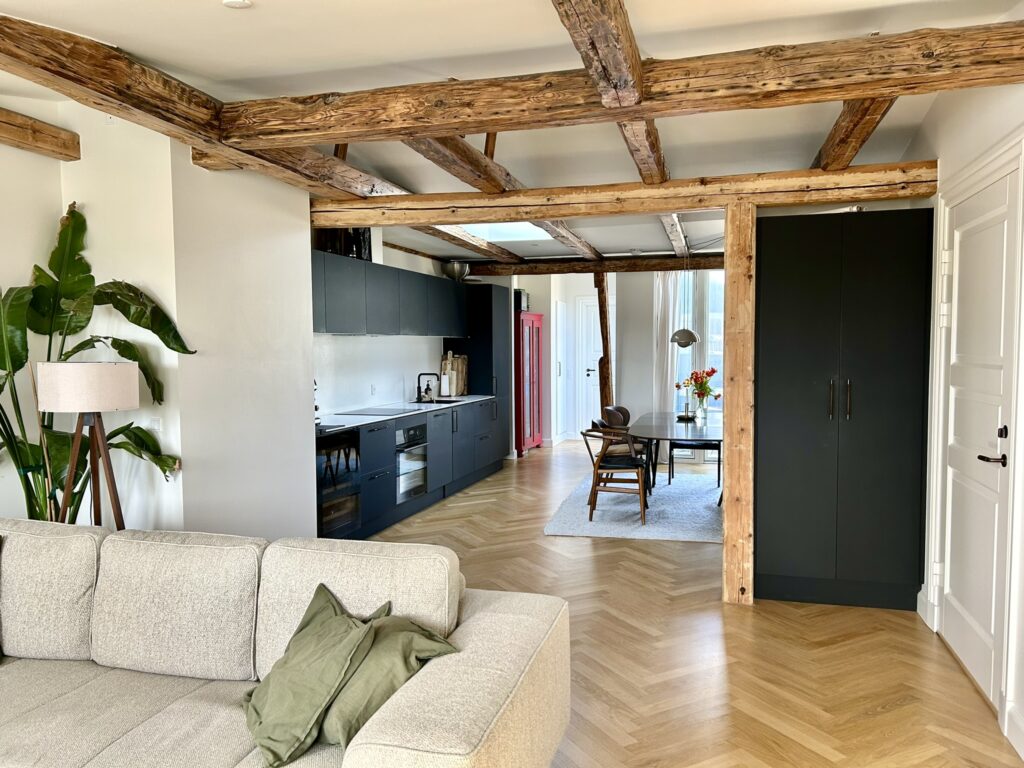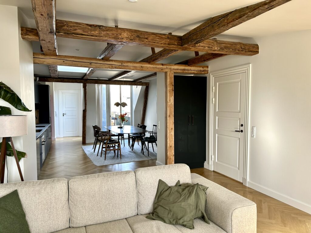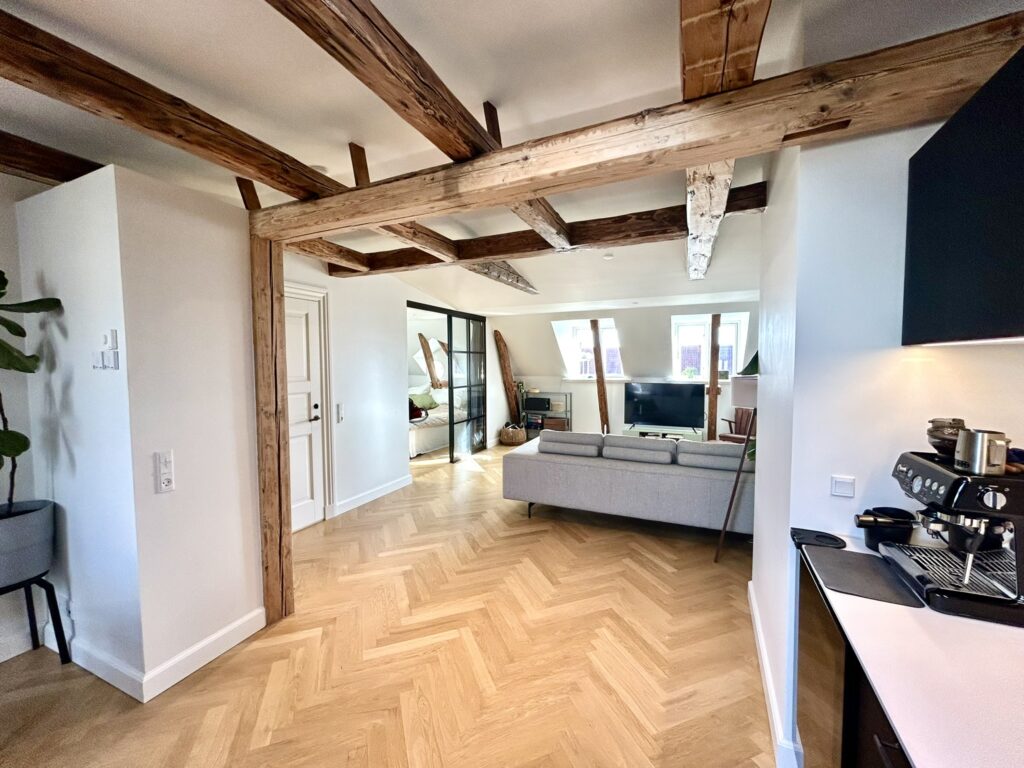Lejligheden er beliggende på 3. sal, og er indrettet med en fin indgang med garderobeskabe, flot stor stue med smuk bevaret stuk, et lækkert og moderne badeværelse, fantastisk køkkenalrum med udgang til altan, rummeligt soveværelse som er afskærmet med flot New Yorker væg mod stuen. Køkken og bad er med stilfuldt inventar fra Invita, der har den helt perfekte kombination af det klassiske design og et moderne tvist. Badeværelset bliver hvidt med røget egetræs lameller og køkkenet er mat sort med bronze greb. Lejligheden er med flotte mat lakerede sildebensparket i eg, gulvvarme i alle rum, alt i hårde hvidevarer samt quooker og vinkøleskab. Straks man træder ind i lejligheden, vil man opleve, at der ved ombygningen er taget højde for ejendommens oprindelig karakter og er kælet for alle detaljer og materialer.