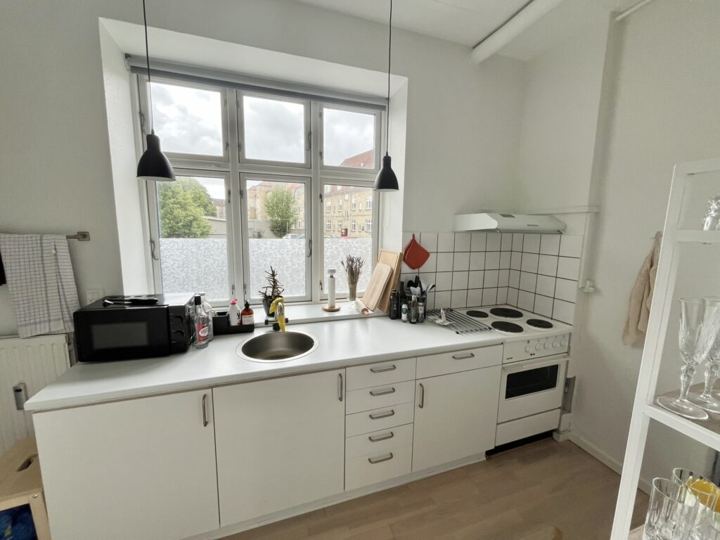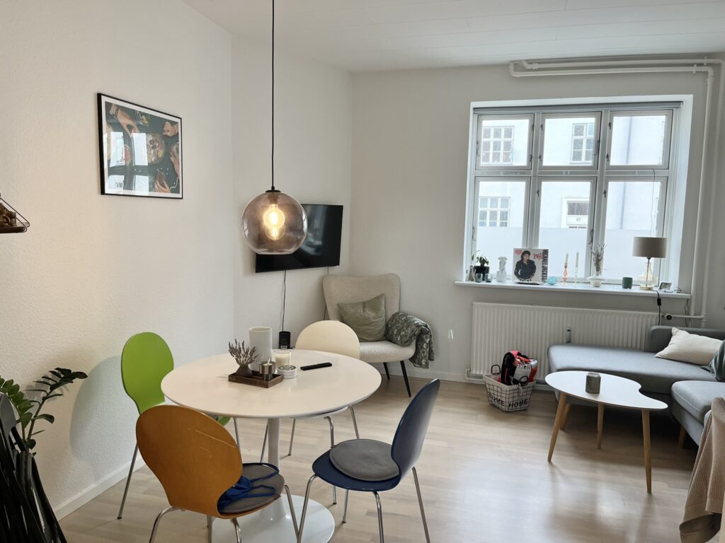 Denne hyggelige og velindrettede lejlighed ligger i Øgadekvarteret blot 1,5 km fra byens gågader. Området byder på gode indkøbsmuligheder, masser af parkeringsmuligheder tæt ved lejligheden, nemt til offentlig transport og det smukke grønne område Østre Anlæg.
