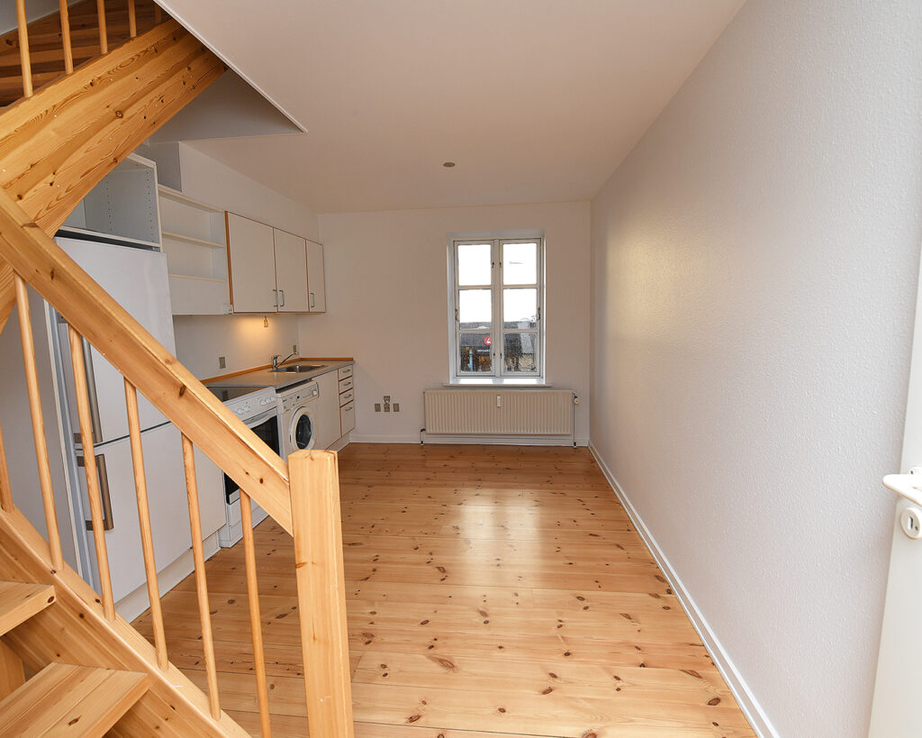Lejligheden er indrettet med stor entré med faste skabe, flot og rummeligt badeværelse med bruseniche samt lyst køkkenalrum med trappe op til opholdsrum/soveværelse, der nemt med en rumdeler eller lignende kan indrettes som både soveværelse og hyggelig opholdsstue.