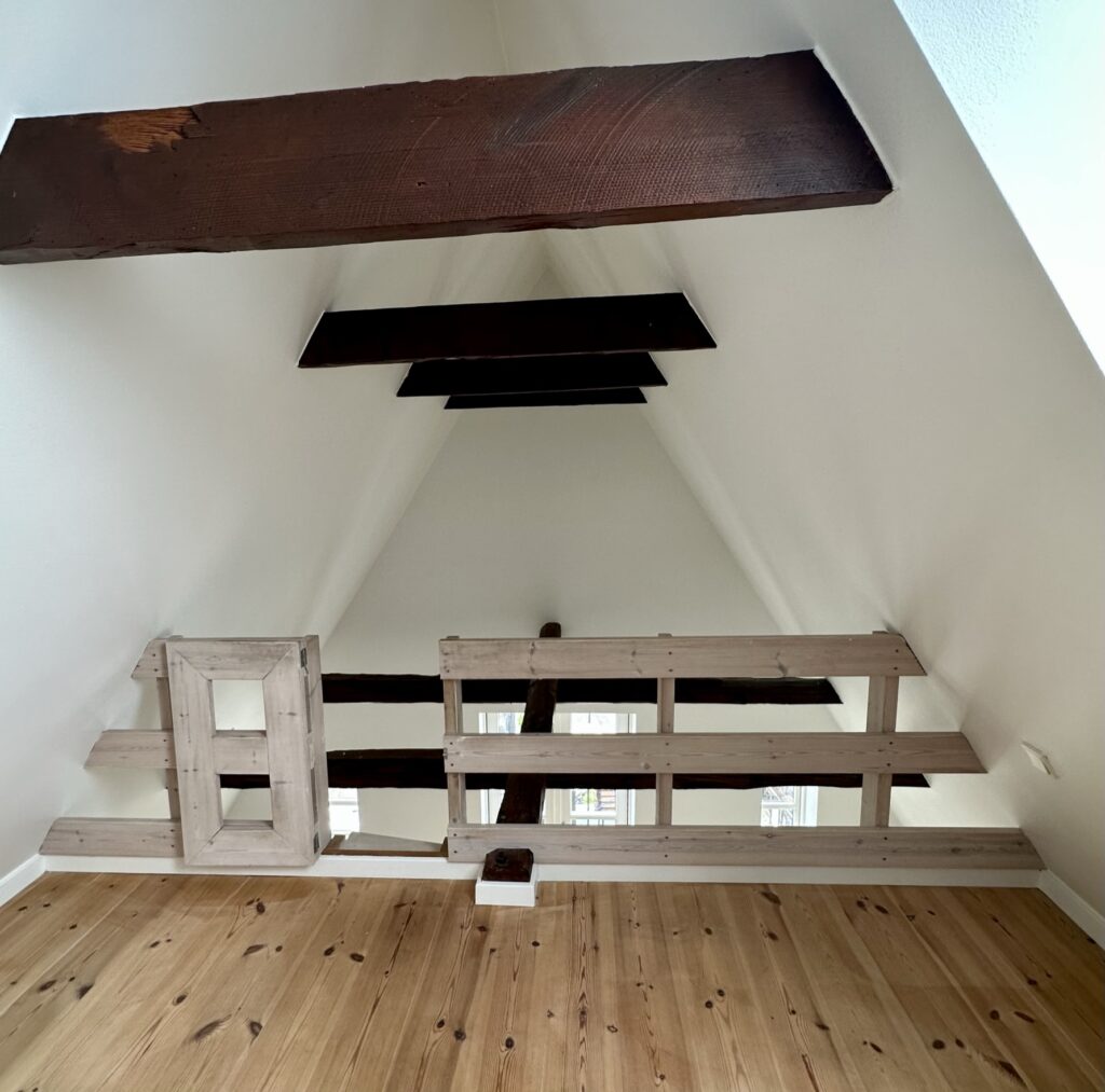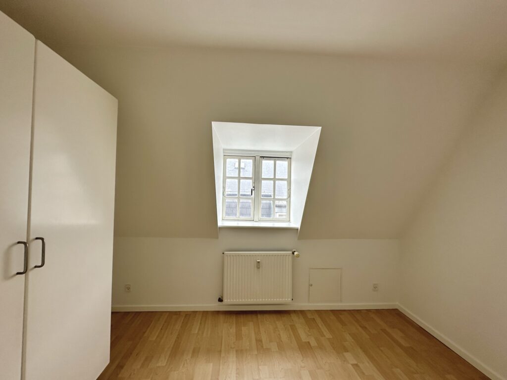 I lejligheden er der synlige bjælker og skråvægge, der giver lejligheden sjæl og charme.
