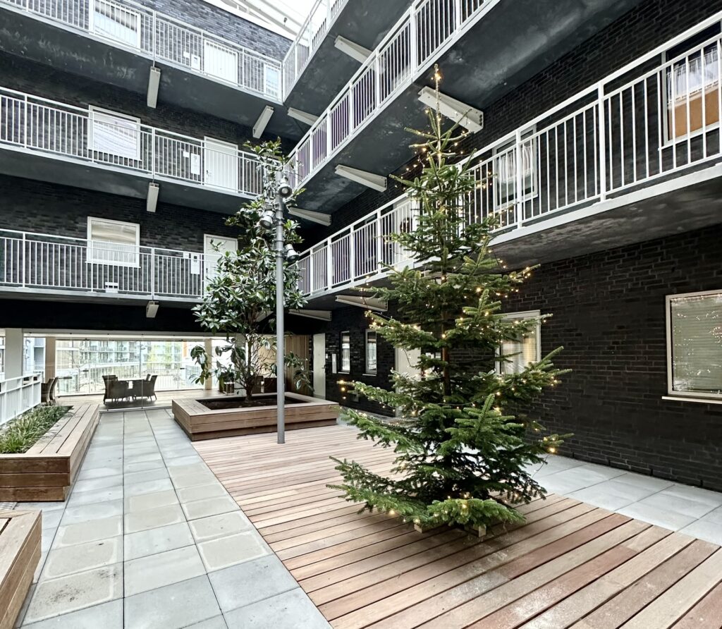 På 1. sal er der en smuk atriumgård med springvand, levende planter og fælles lounge, og på 5. sal dejlig fælles tagterrasse – hvor der er rig mulighed for at nyde sommersolen og udsigten over byen. Ejendommens kælder rummer kælderrum til lejlighederne og en lækker parkeringskælder med bilelevator, hvor der kan lejes en fast nummereret parkeringsplads.