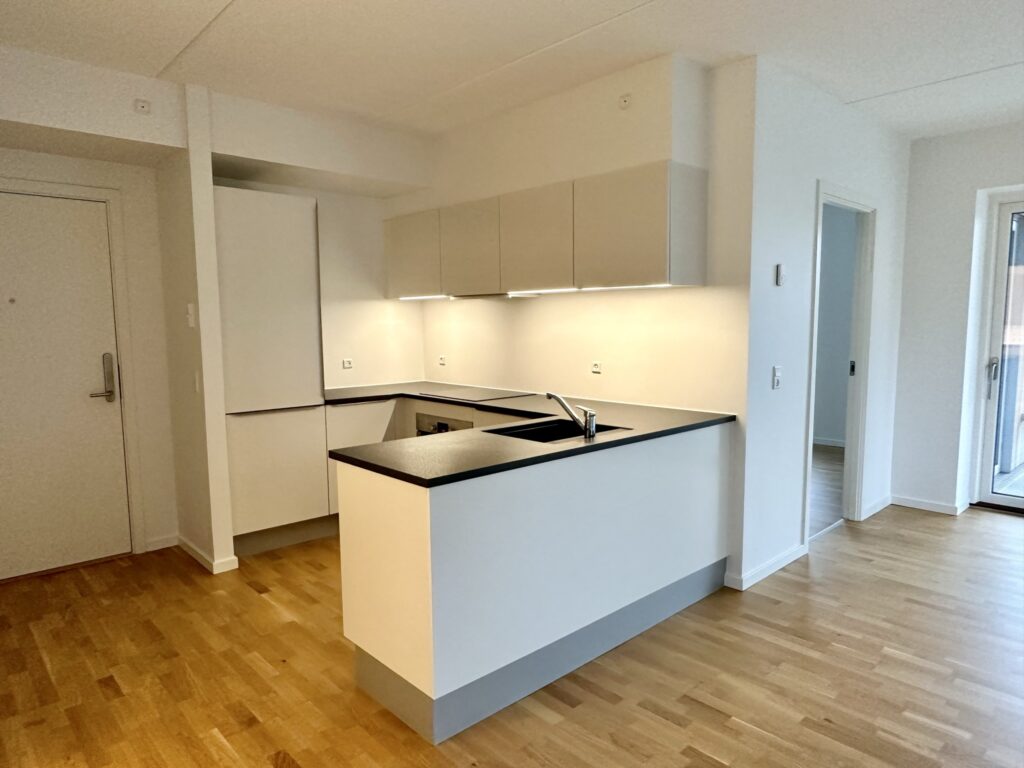 Lad os tage en klassisk gennemgang af lejligheden: Vi starter med at træde ind i entréen, der ligger i åben forbindelse med det rummelige og lyse køkkenalrum. Køkkenet er et skønt Invita køkken med flotte tidsløse hvide fronter, masser af skabs- og bordplads samt alt i hårde hvidevarer. Alrummet har et smukt lys indfald fra de sydvendte vinduer og det store vinduesparti med skydedøren til altanen.
