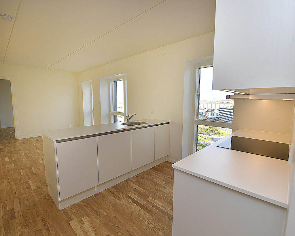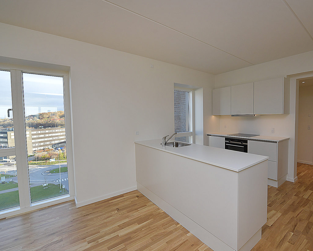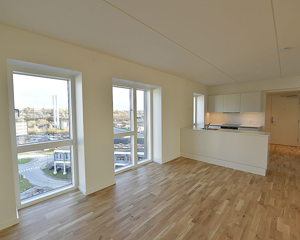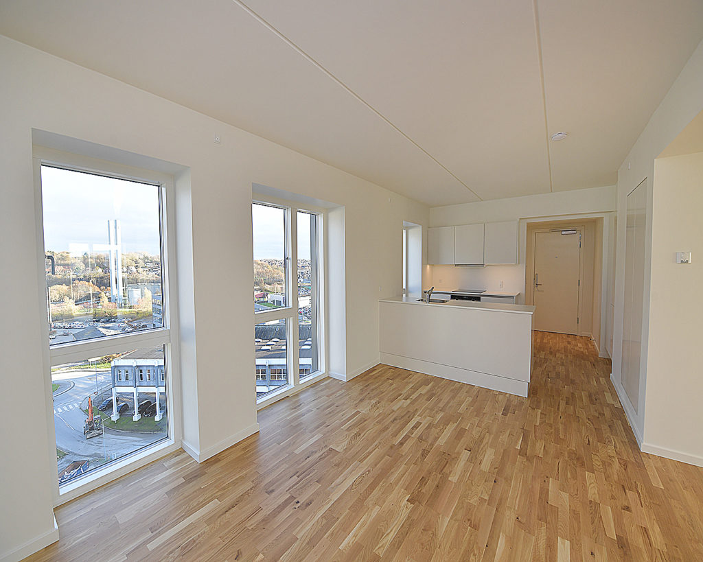 Lejligheden er indrettet med en stor lys stue i åben forbindelse med det flotte hvide køkken. Stuen er med vinduer mod både øst og vest, hvilket sikre er flot lysindfald i lejligheden og en smuk udsigt i begge retninger. Stuens størrelse og indretning giver rig mulighed for at indrette rummet med en opholds- og en spisestue i åben forbindelse. Fra stuen er der adgang til den vestvendte altan med udsigt så langt øjet rækker. Lejligheden byder herudover på et rummeligt soveværelse med skabsvæg, et ekstra soveværelse/kontor med skab, et lækkert stort badeværelse og et fint bryggers med kombineret vaske-/tørremaskine.