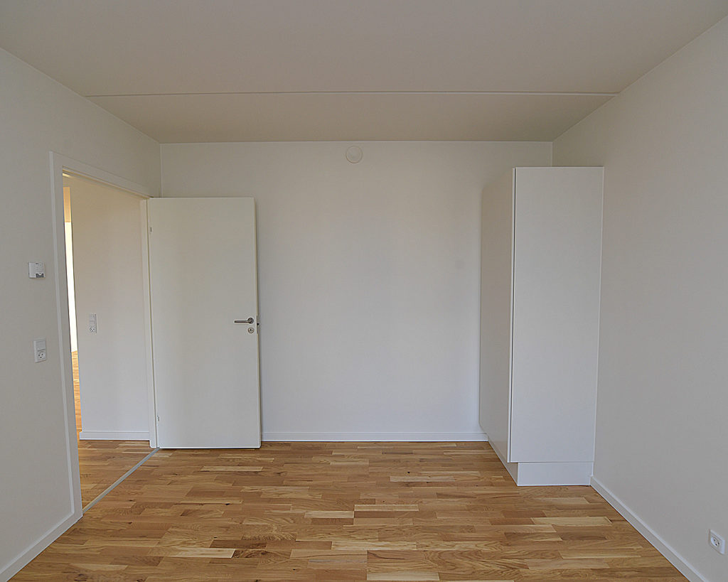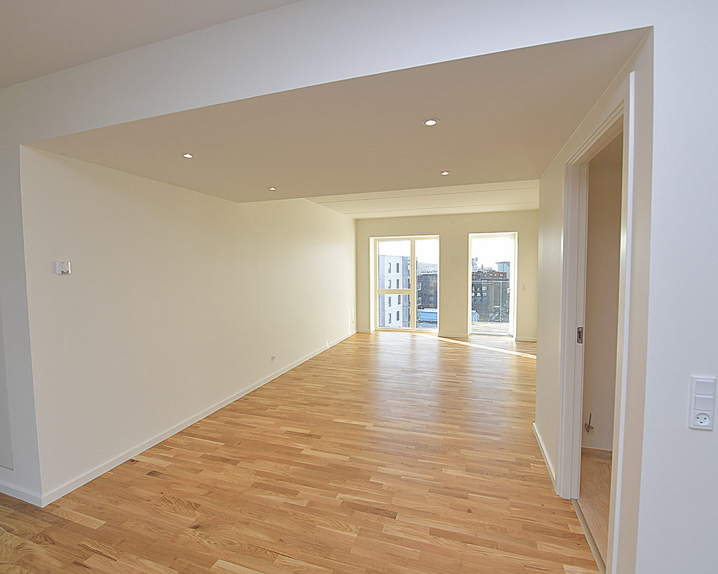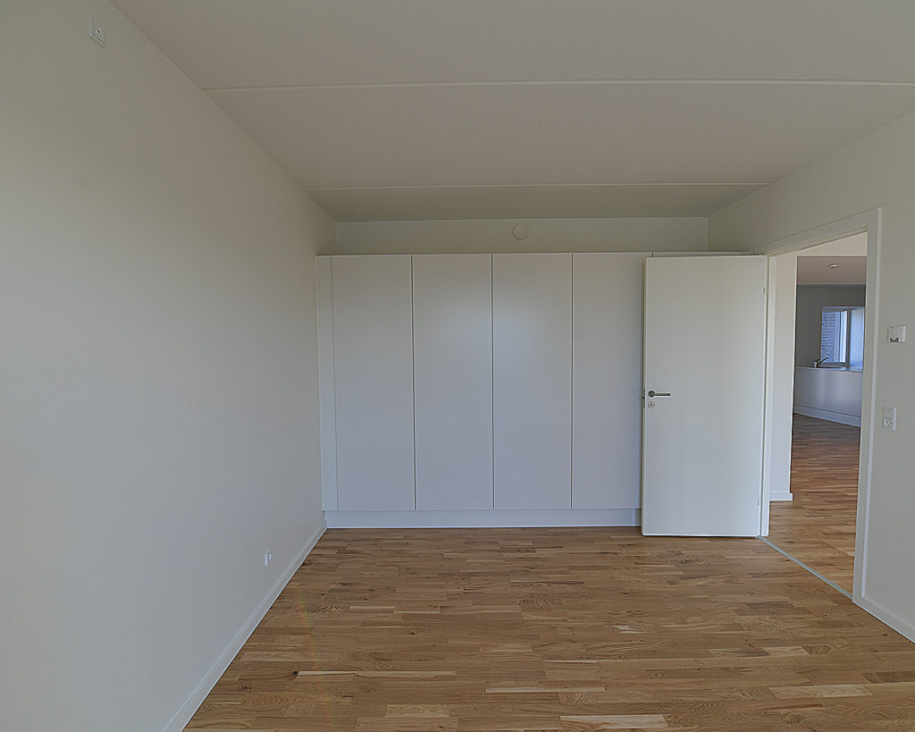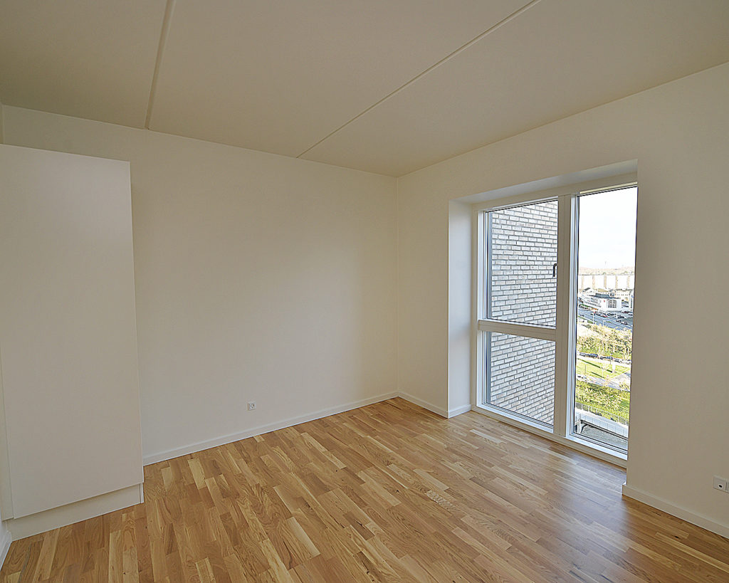 Lejligheden er indrettet med en stor lys stue i åben forbindelse med det flotte hvide køkken. Stuen er med vinduer mod både øst og vest, hvilket sikre er flot lysindfald i lejligheden og en smuk udsigt i begge retninger. Stuens størrelse og indretning giver rig mulighed for at indrette rummet med en opholds- og en spisestue i åben forbindelse. Fra stuen er der adgang til den vestvendte altan med udsigt så langt øjet rækker. Lejligheden byder herudover på et rummeligt soveværelse med skabsvæg, et ekstra soveværelse/kontor med skab, et lækkert stort badeværelse og et fint bryggers med kombineret vaske-/tørremaskine.