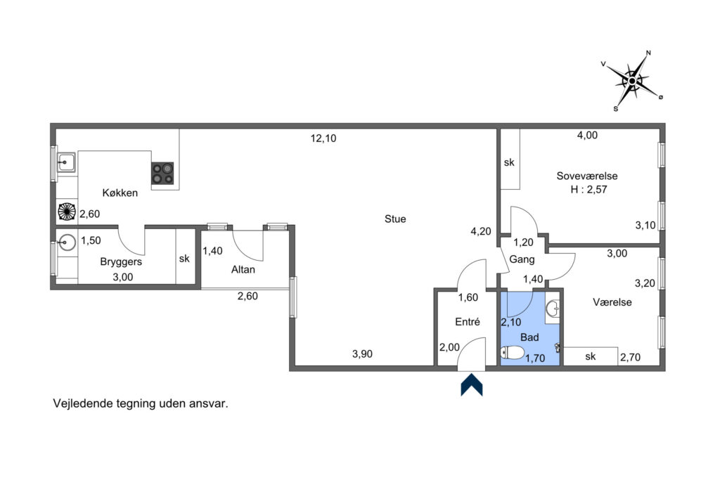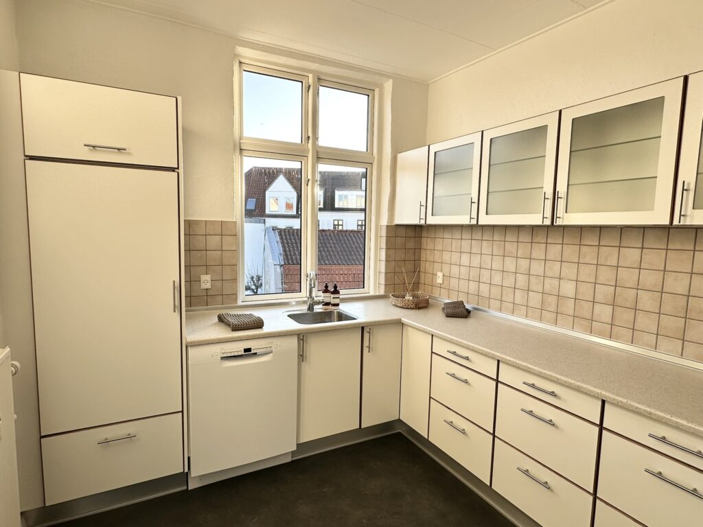 Lejligheden indeholder: Entre, stor vinkelstue i åben forbindelse med køkken alrum. Fra køkkenet er der adgang til bryggers med kombi vaske-/tørremaskine samt fryser. Fra køkken alrum er der ligeledes udgang til lejlighedens altan. Lille fordelingsgang med adgang til nyere badeværelse fra 2018 med bruseniche og skabsarrangement fra Invita. Dejligt soveværelse og værelse med faste skabe ligeledes fra Invita. Der er flotte lakerede gulve i lejligheden.