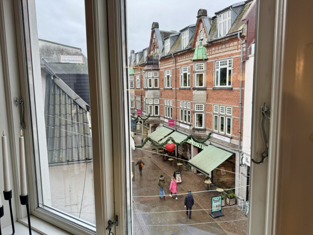 Beliggende med udsigt til gågaden på den ene side og C. W. Obels Plads på den anden side, er lejligheden drømmen for alle, der gerne vil have byens mange caféer og butikker så tæt på som muligt.