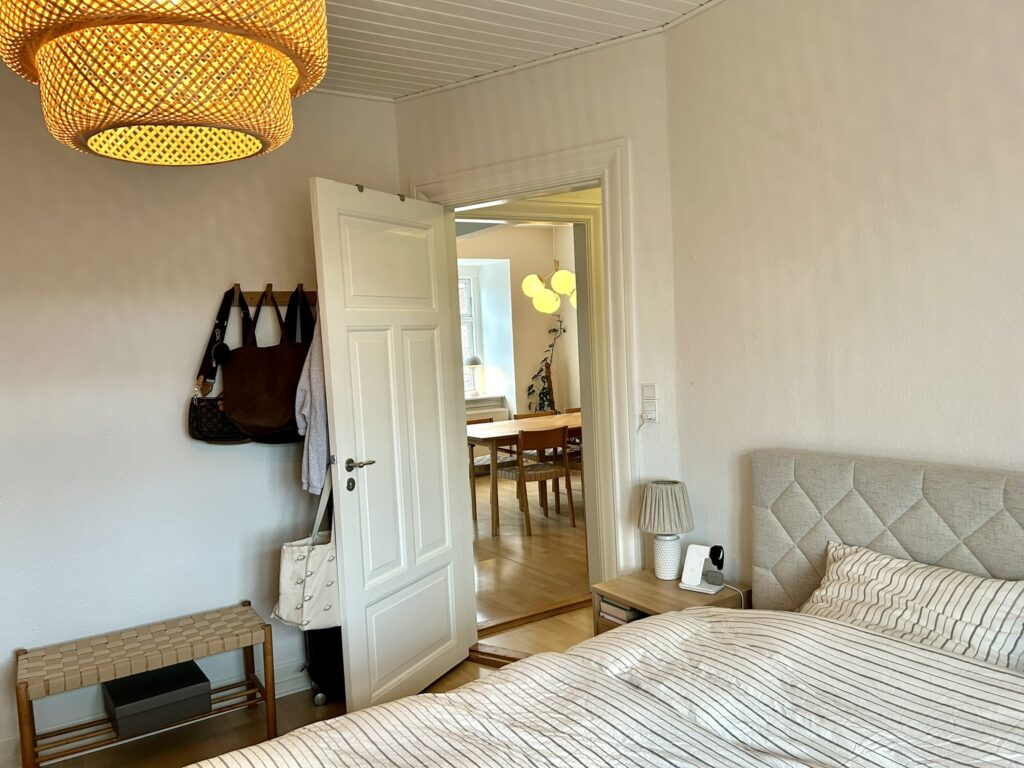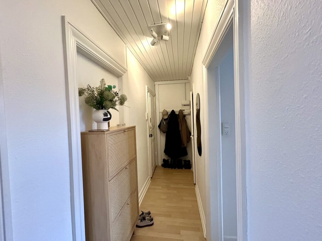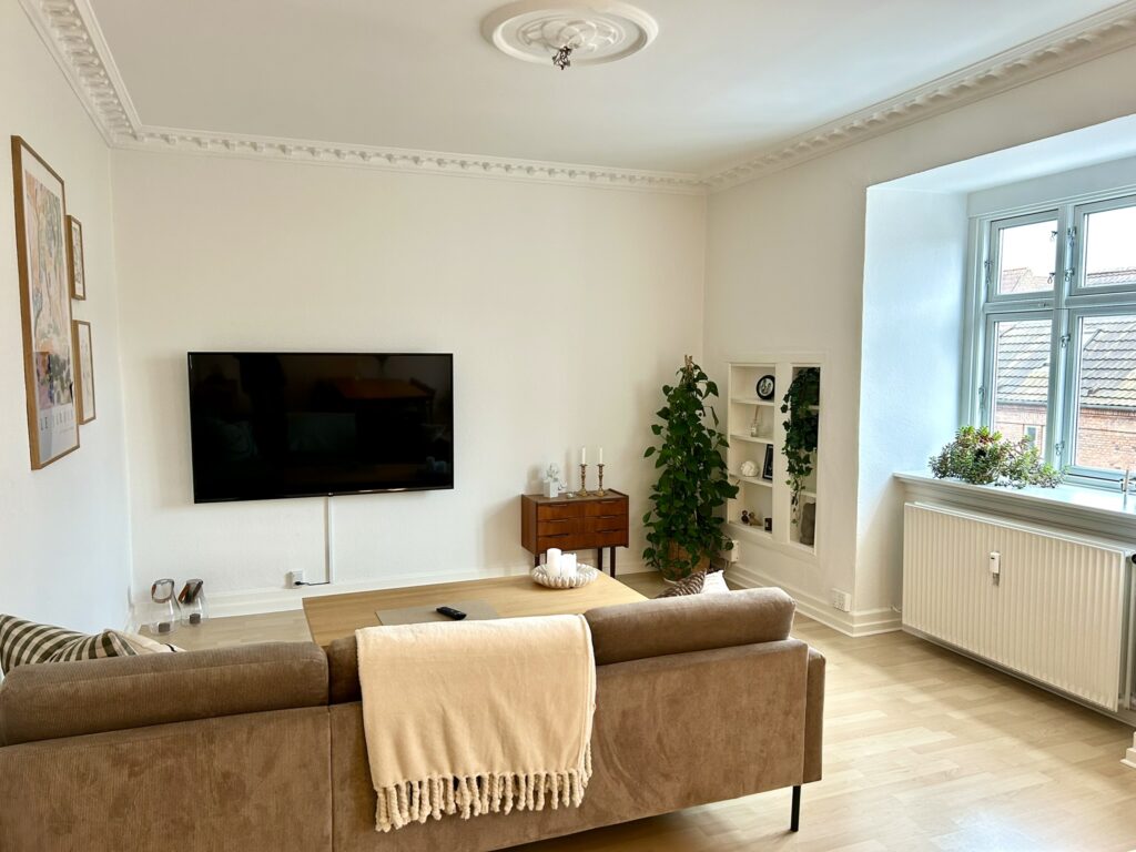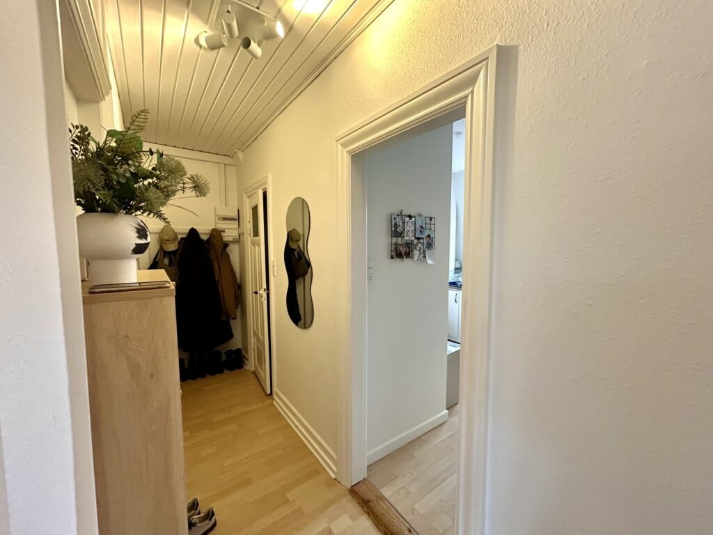 Lejligheden er indrettet med en god og rummelig fordelingsgang, en meget stor og lys stue med rigelig god plads til både spisebord, sofagruppe og evt. kontorplads. Soveværelset, der vender mod gården, er også dejlig rummeligt, så der er fin plads til hele garderoben. Herudover er der et lyst og tidsløst køkken med god bordplads samt et fint badeværelse med brus.