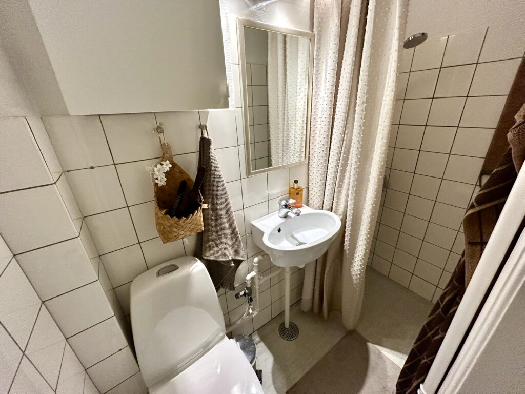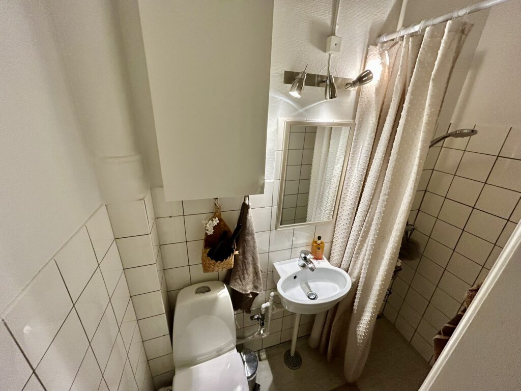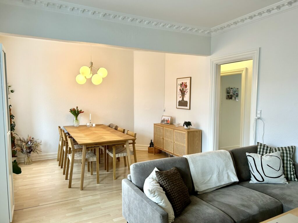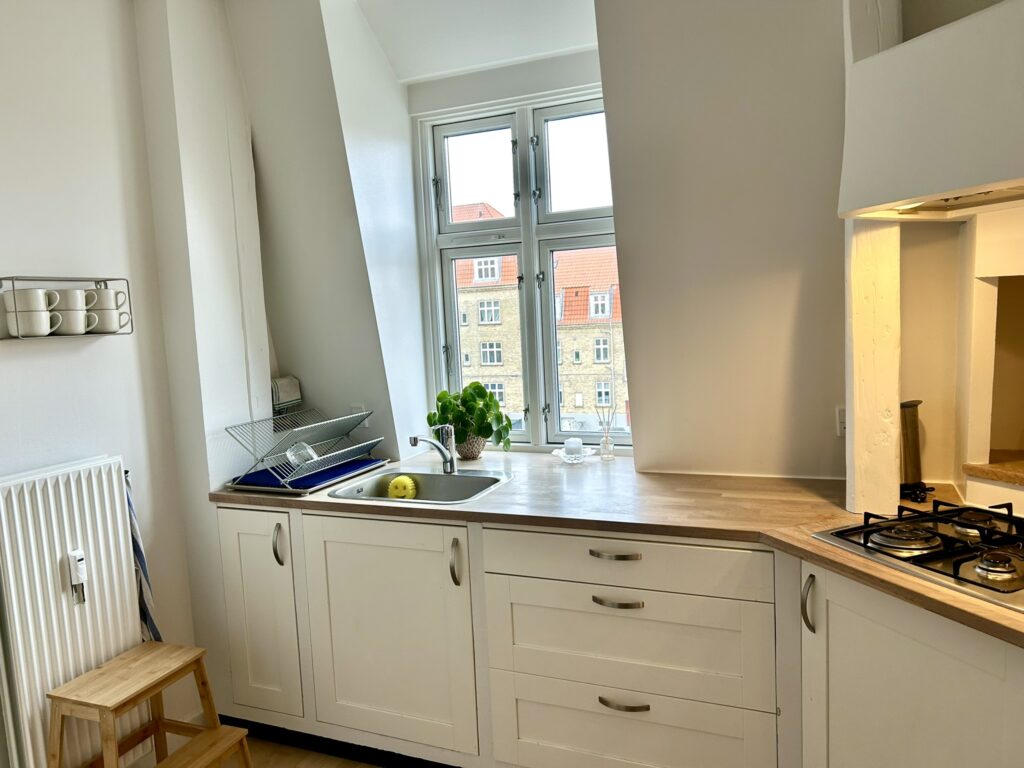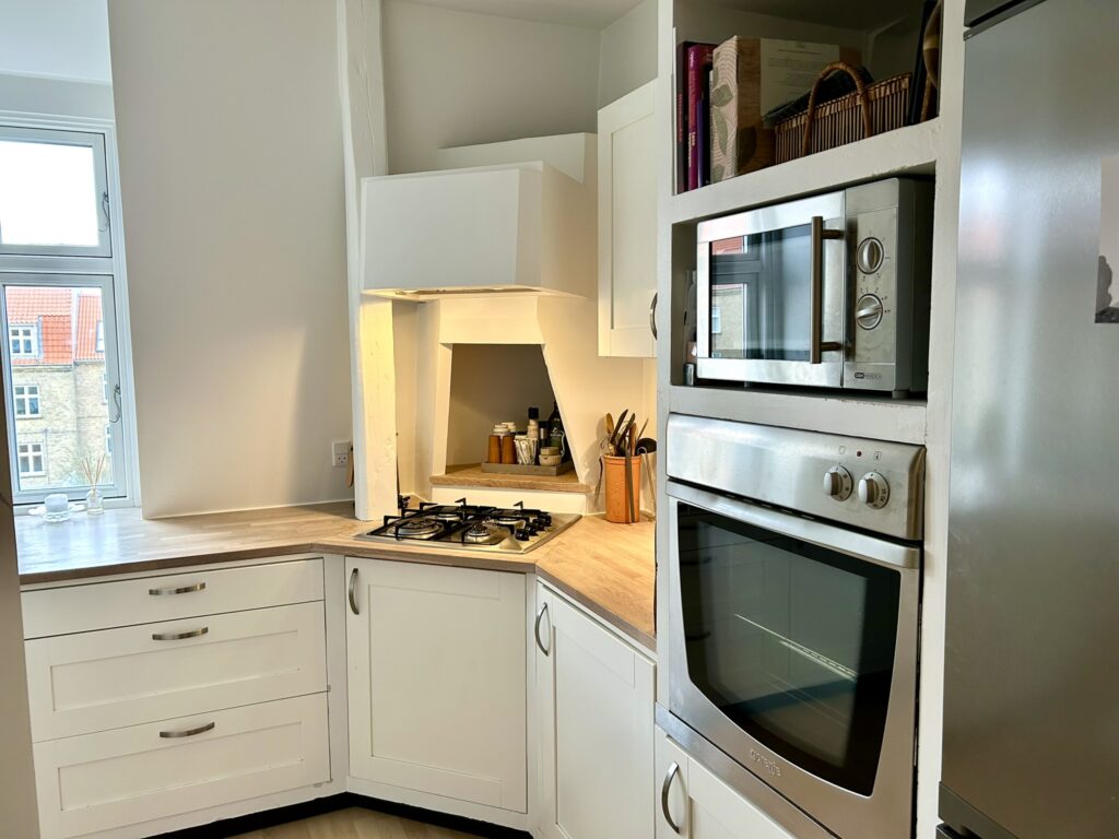 Lejligheden er indrettet med en god og rummelig fordelingsgang, en meget stor og lys stue med rigelig god plads til både spisebord, sofagruppe og evt. kontorplads. Soveværelset, der vender mod gården, er også dejlig rummeligt, så der er fin plads til hele garderoben. Herudover er der et lyst og tidsløst køkken med god bordplads samt et fint badeværelse med brus.