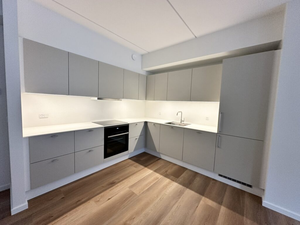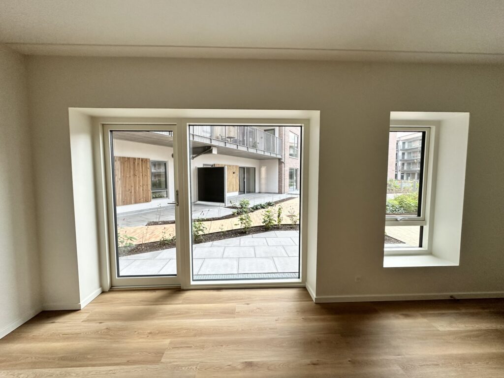 Lejligheden byder på en entré med faste skabe, stort og rummeligt køkken/alrum med lækkert HTH køkken med alt i hårde hvidevarer. Fra leverummet er der adgang til et stort badeværelse med vaskesøjle og adgang til de to store værelser. Der er garderobeskab på værelserne og begge har udgang til den store altan. Fra altanen er der kig til park og fjord. Lejligheden byder ligeledes på en terrasse mod gårdmiljøet.
