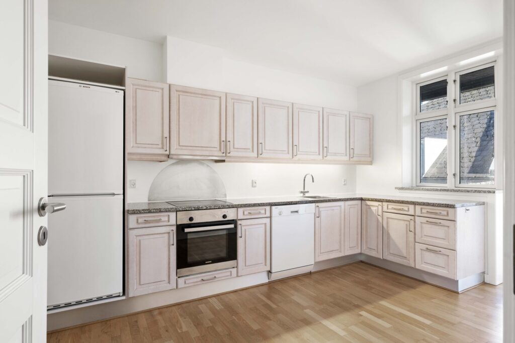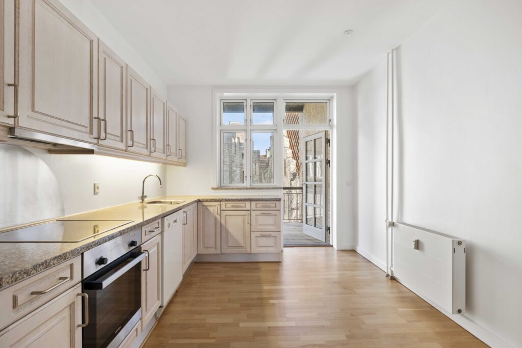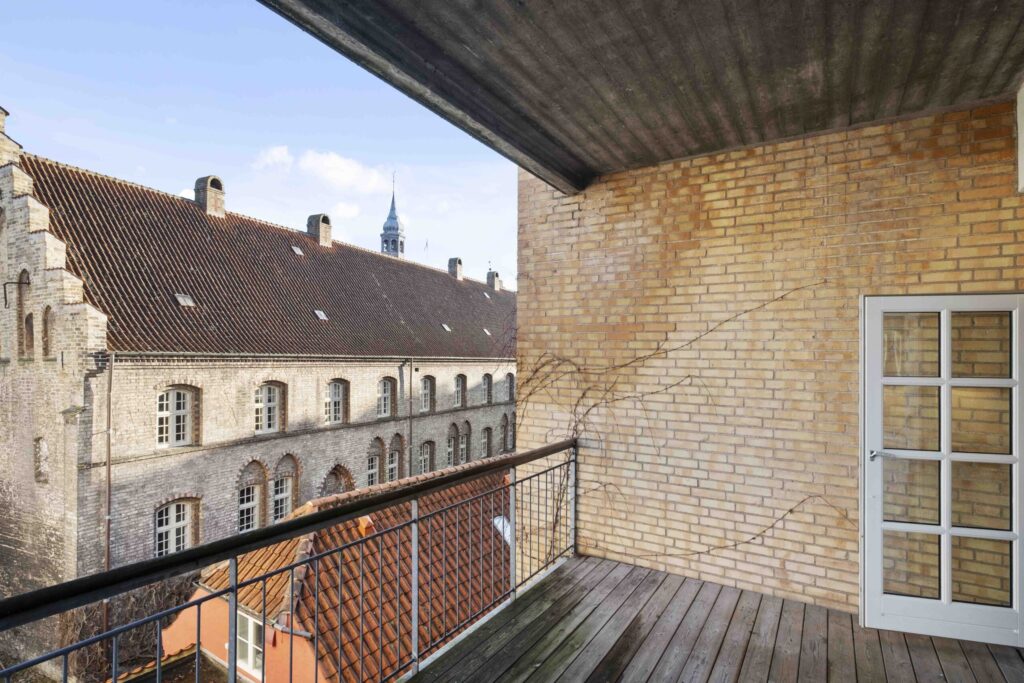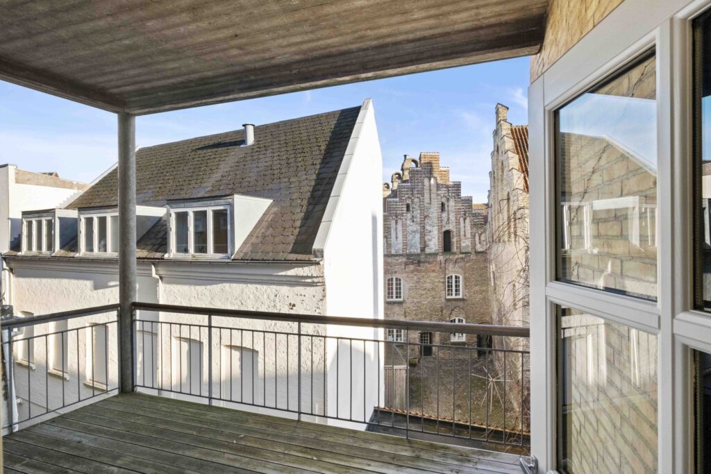 Fra lejlighedens hyggelige køkken er der udgang til dejlig stor altan, hvorfra der er kig til det smukke gamle kloster.