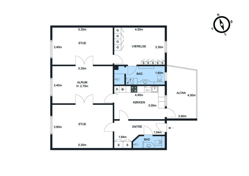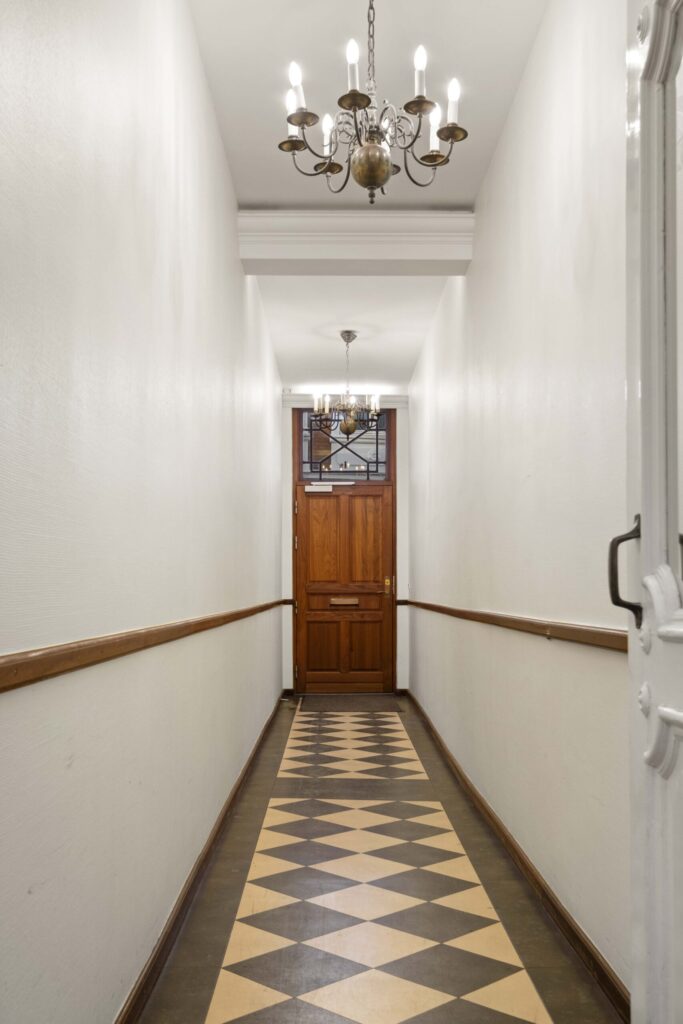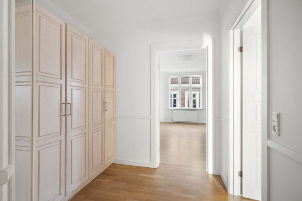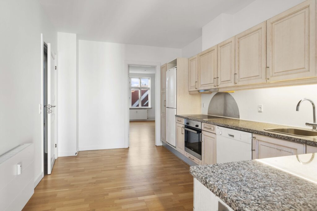 Lejligheden indeholder en rummelig entré med faste skabe og god plads til modtagelsen af gæster. Fra entréen er der adgang til et flot gæstebadeværelse samt dejligt køkken og den første af de 3 stuer én suite.