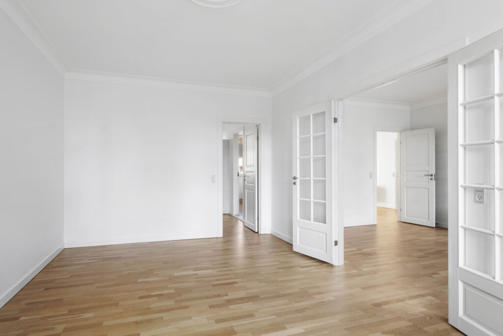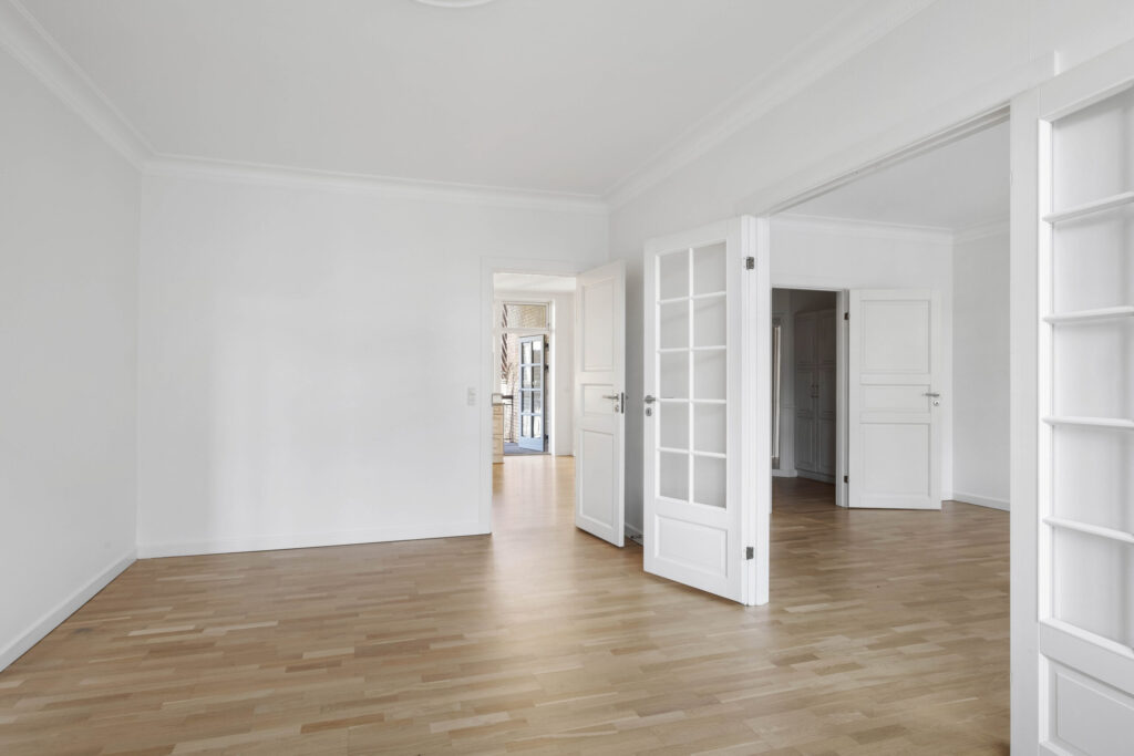 De 3 store og lyse stuer, der vender mod Gravensgade er opdelt af flotte franske døre og er alle med smukke trægulve og højt til loftet. Den ene af stuerne kan nemt indrettes som værelse eller kontor efter behov. Herudover rummer lejligheden et dejligt stort soveværelse med skabsvæg og adgang til stort badeværelse.