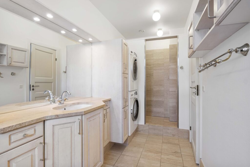 Begge badeværelser er med flotte skabsarrangementer med travertinbordplade, ligesom der er travertin på gulv og i bruseniche.