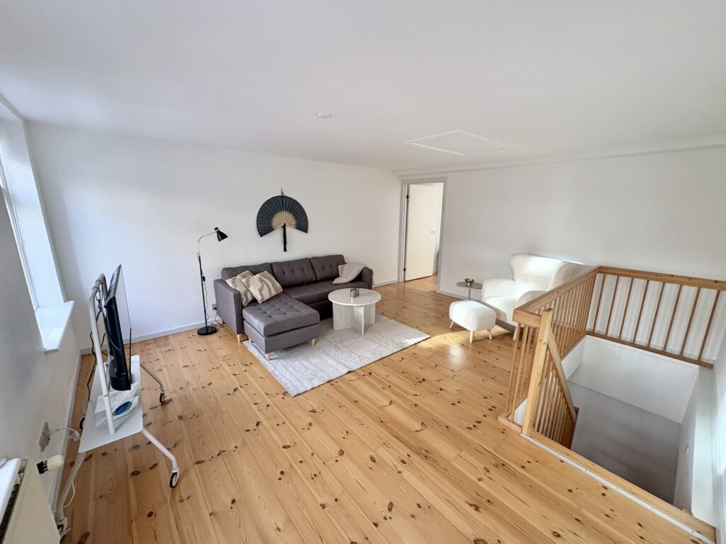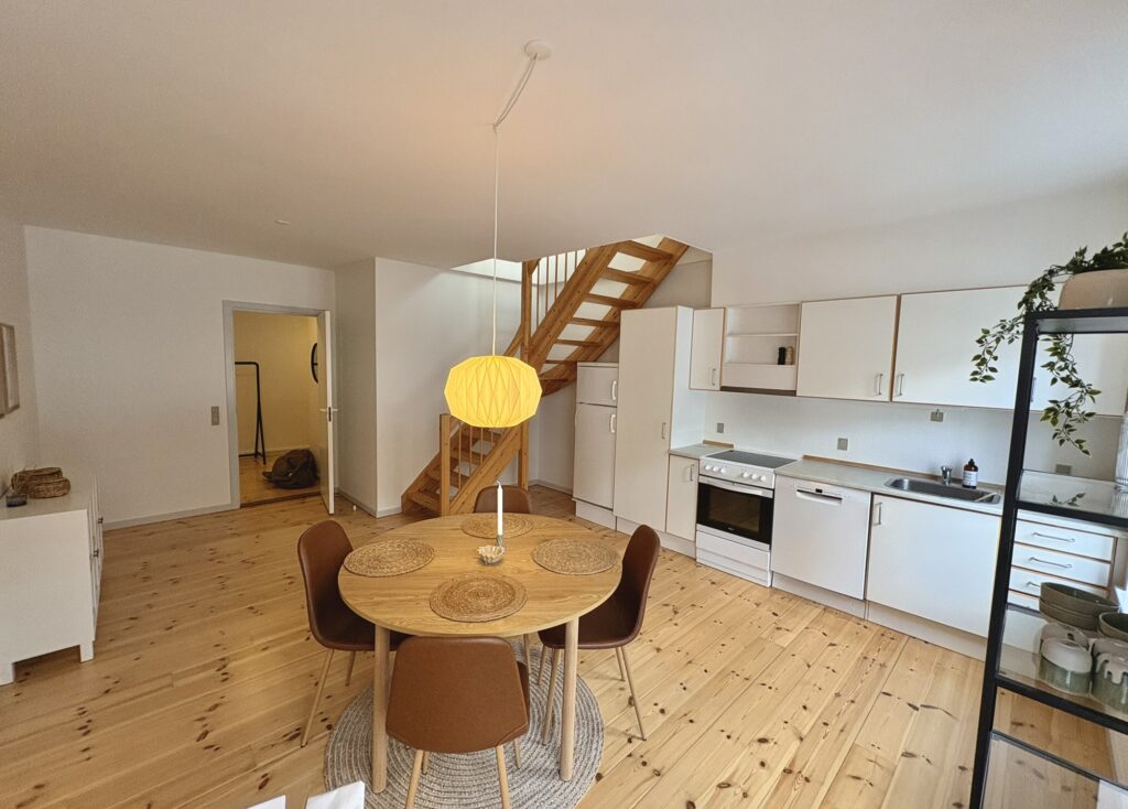 Fra køkkenalrummet fører en trappe op til lejlighedens overetage, hvor du finder en stor opholdsstue samt et rummeligt soveværelse med god skabsplads og ovenlysvindue.