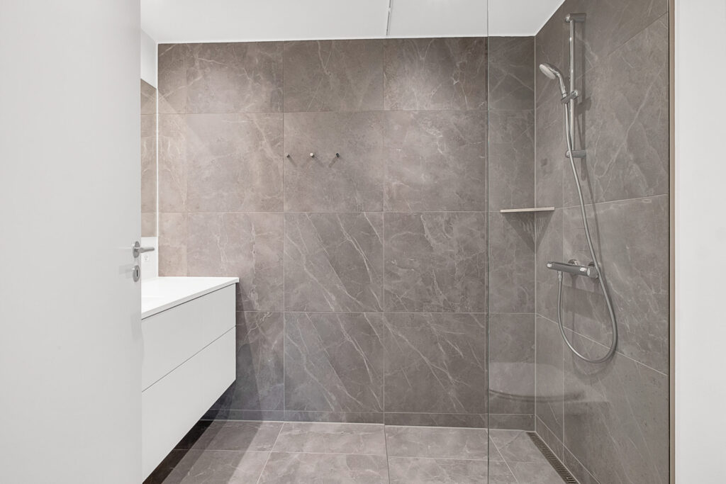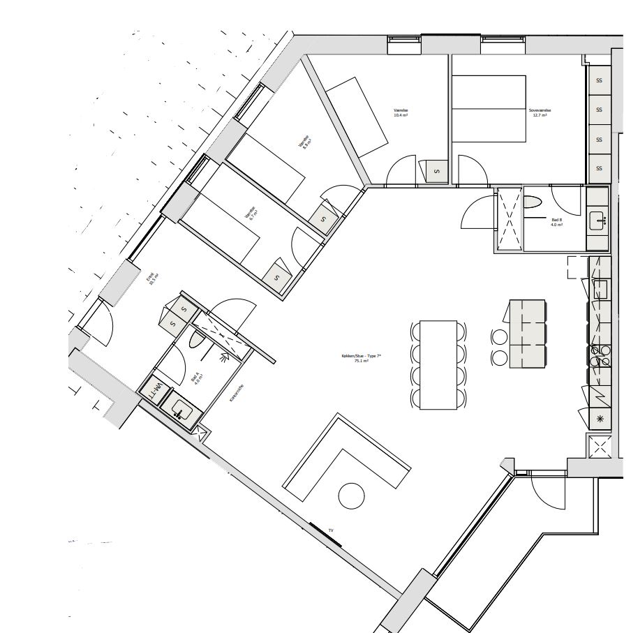 Her er god plads til spiseplads, stue og hvis familien skal samles. Fra leverummet er der udgang til den store skønne altan. Alle 4 værelse ligger med udgang til leverummet og fra soveværelset er der separat adgang til lejlighedens andet skønne badeværelse. Soveværelset er udstyret med en hel skabsvæg og alle andre værelser er ligeledes med skab.