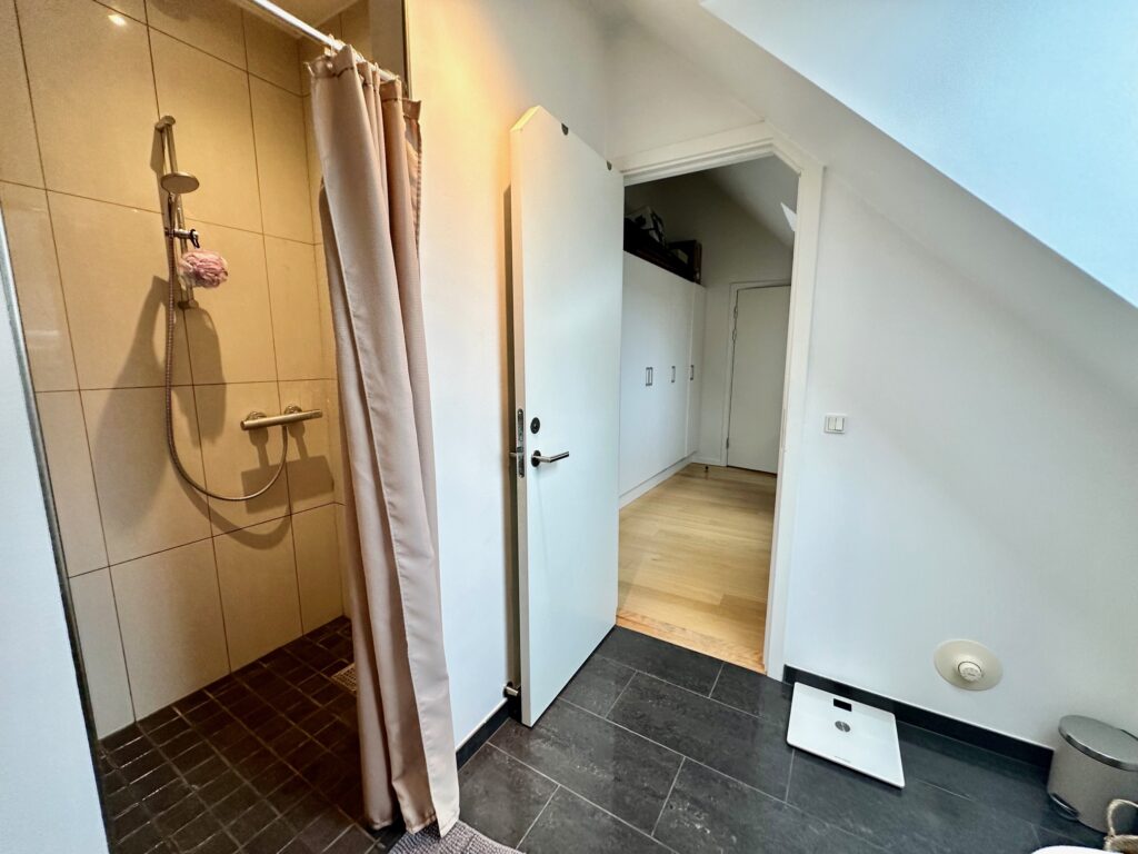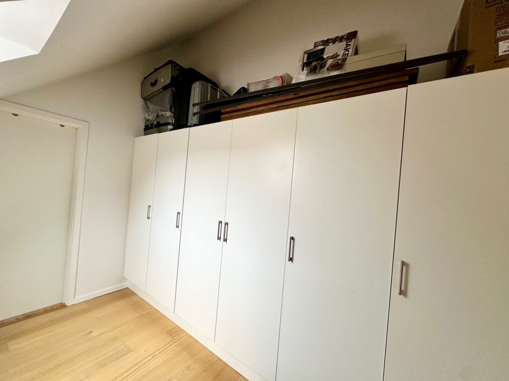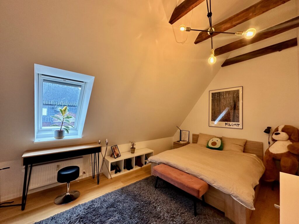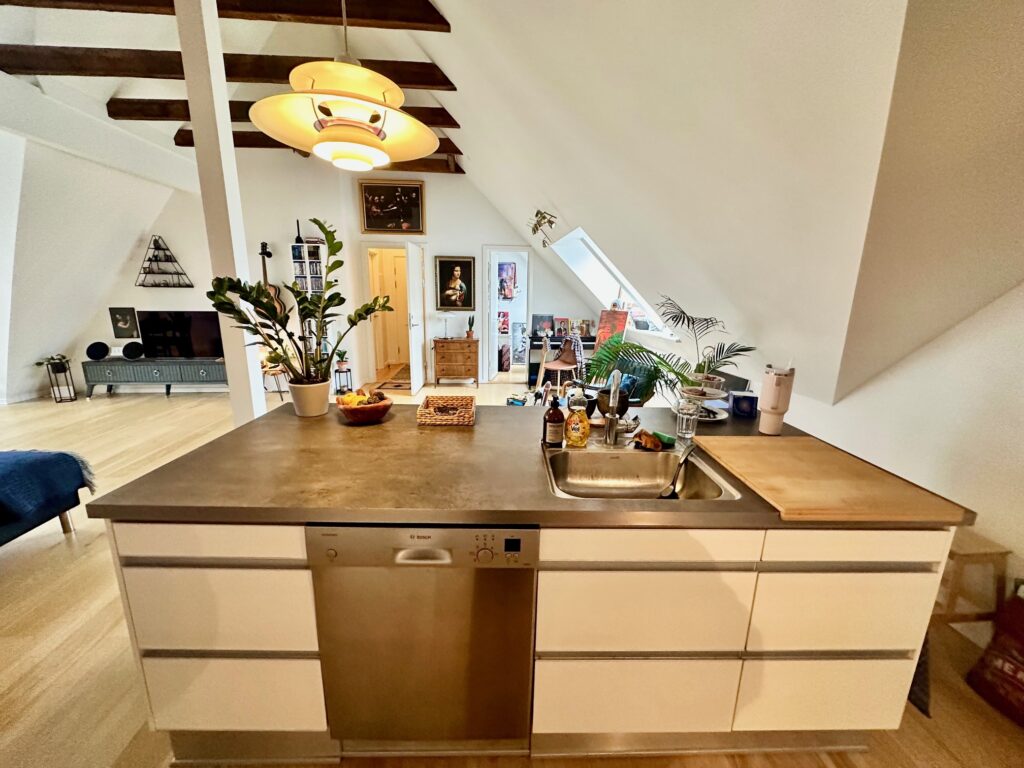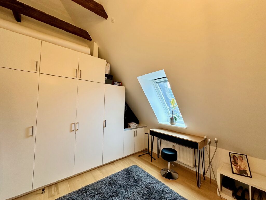 Lejligheden byder velkommen i en entré med gode, indbyggede skabe. Herfra er der adgang til et rummeligt soveværelse – også med faste skabe – samt et lyst og indbydende køkken/alrum/stue i hvidt design. Her strømmer dagslyset ind gennem ovenlysvinduerne og giver rummet en helt særlig atmosfære, samtidig med at du får en flot udsigt.
