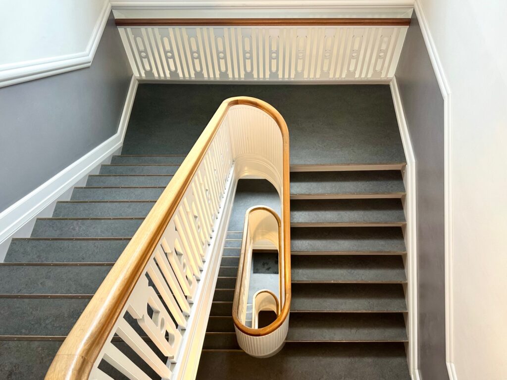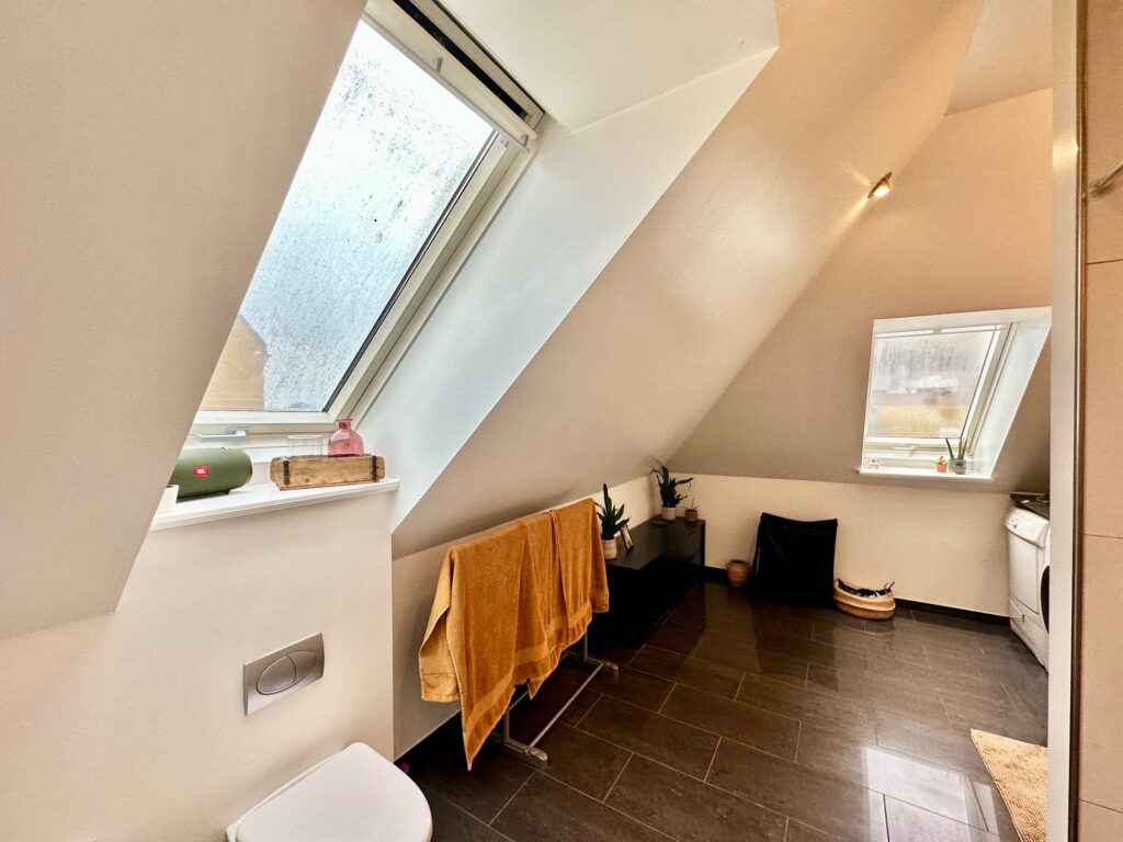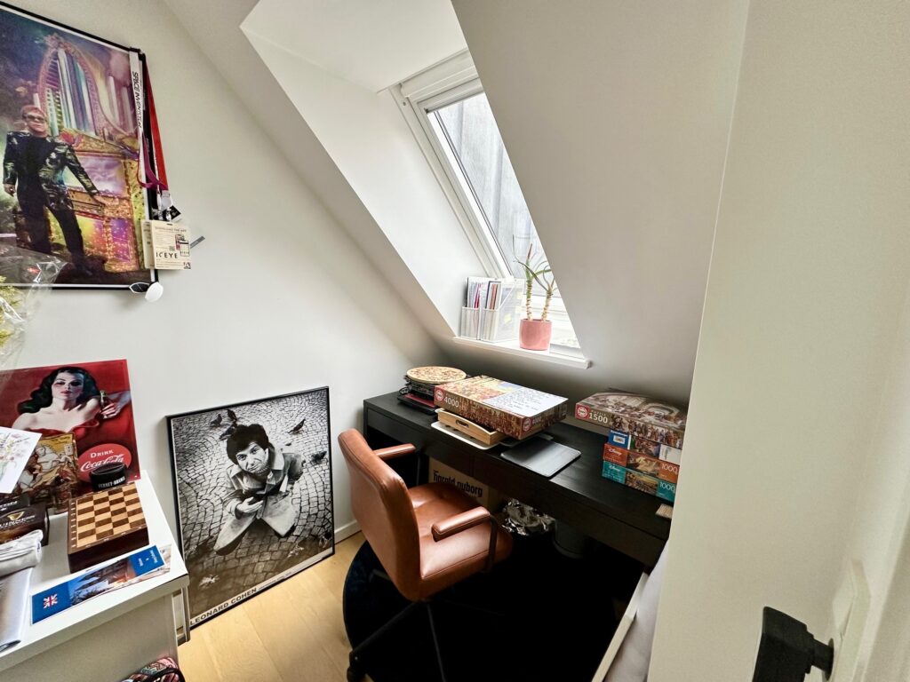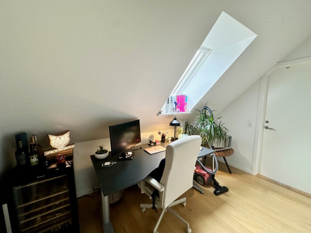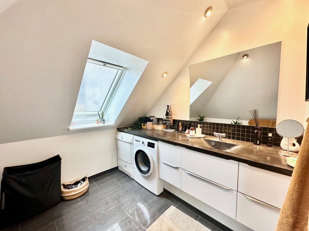 Derudover indeholder boligen et gennemgangsværelse, oplagt som kontor eller ekstra opholdsrum, samt et stort og lyst badeværelse med vaskemaskine og tørretumbler, elegant terrazzobordplade og en god bruseniche. Der er desuden et mindre disponibelt rum til praktisk opbevaring.