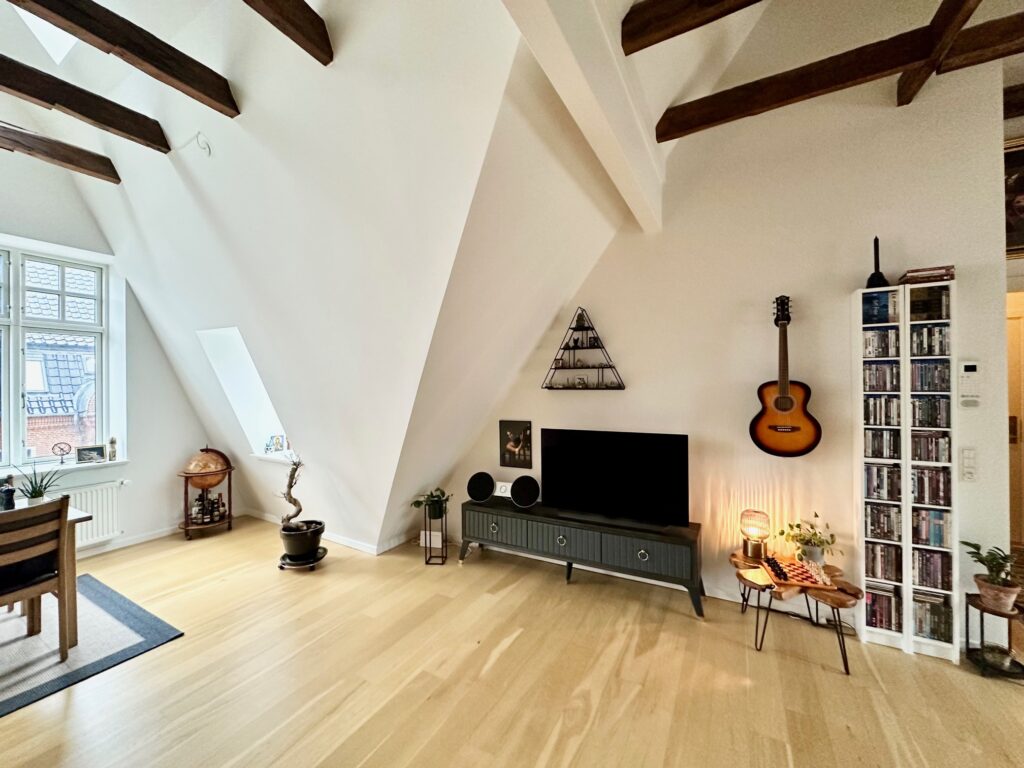 Midt i Aalborg finder du denne helt særlige og indbydende lejlighed med masser af karakter og flotte detaljer. Boligen byder på højt til loftet i entré, værelser og køkken/alrum/stue, hvor de synlige bjælker og smukke egetræsgulve skaber en unik og eksklusiv stemning.