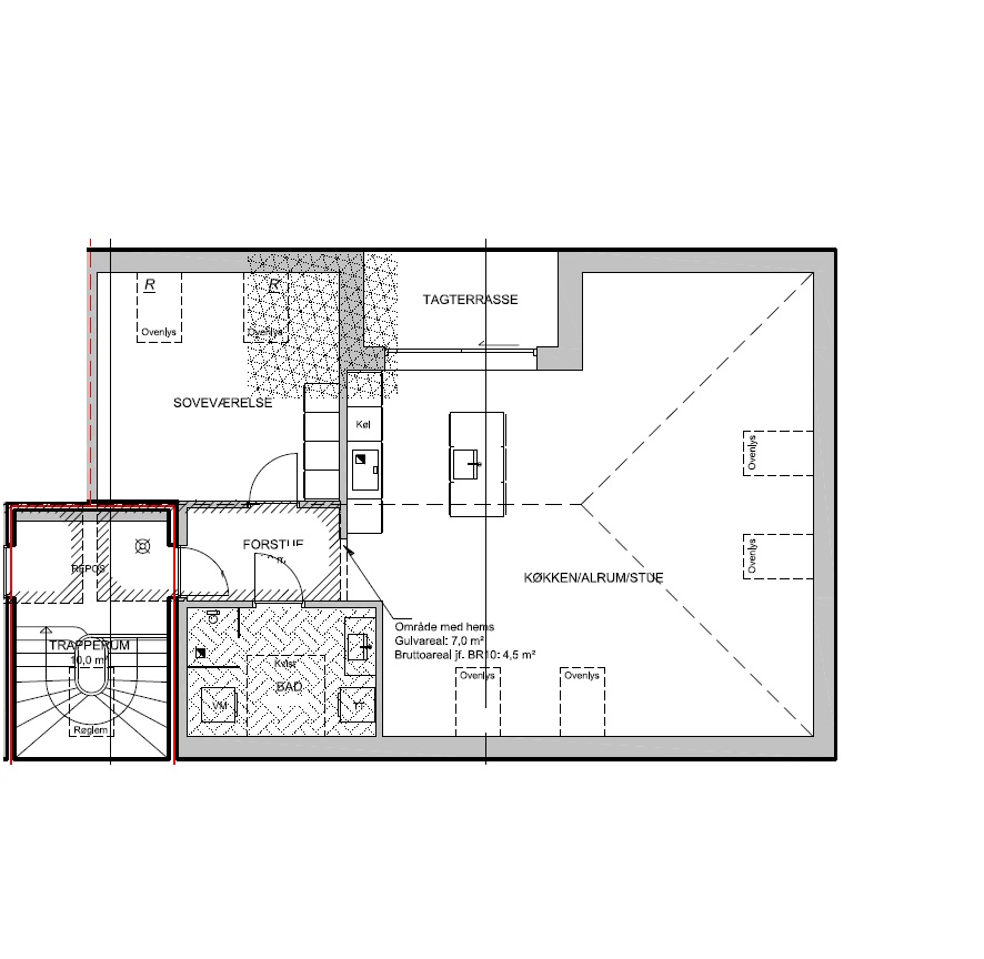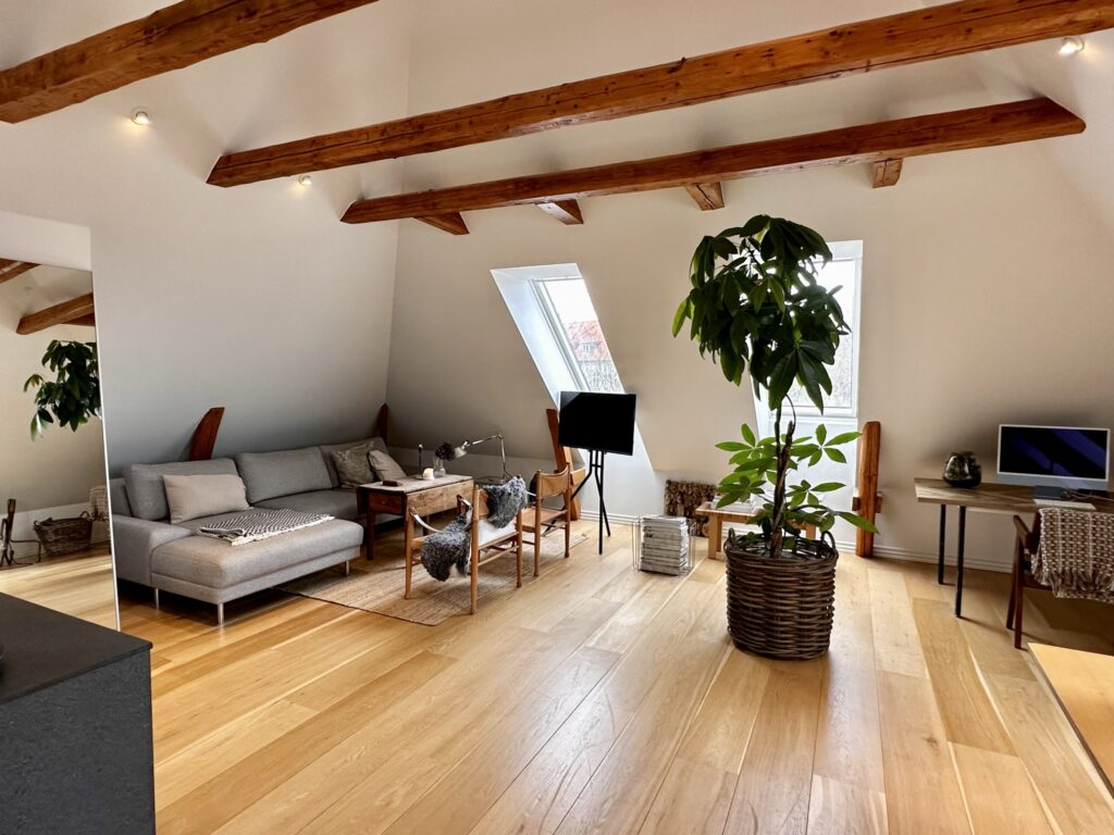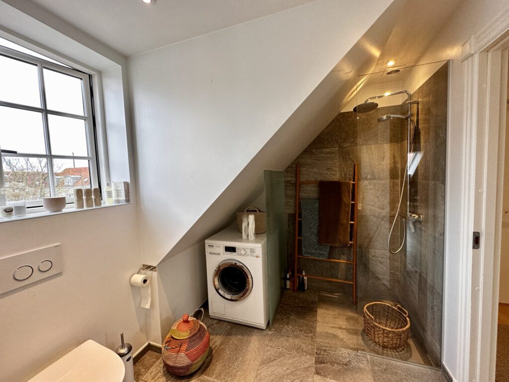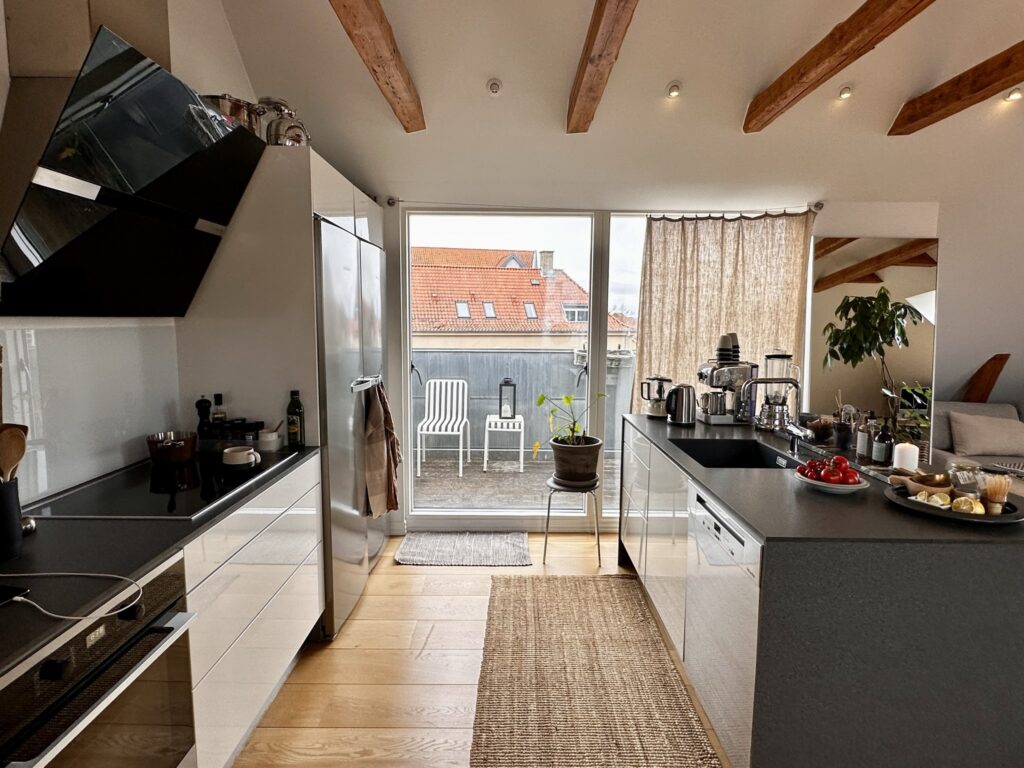Med materialer af bedste kvalitet, egen tagterrasse, loft til kip, fritlagte bjælker, store og lyse rum og meget meget mere, er lejligheden virkelig i særklasse.